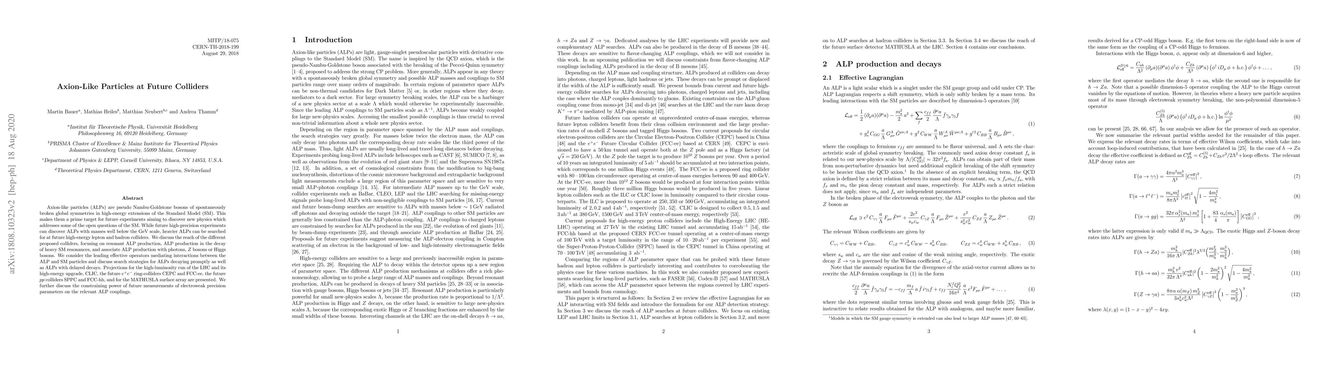 This paper explores the potential of future colliders to detect axion-like particles (ALPs), which are pseudo Nambu-Goldstone bosons in high-energy extensions of the Standard Model. It examines various production mechanisms and search strategies for ALPs at different proposed colliders, including the LHC, CLIC, CEPC, FCC-ee, SPPC, FCC-hh, and MATHUSLA.