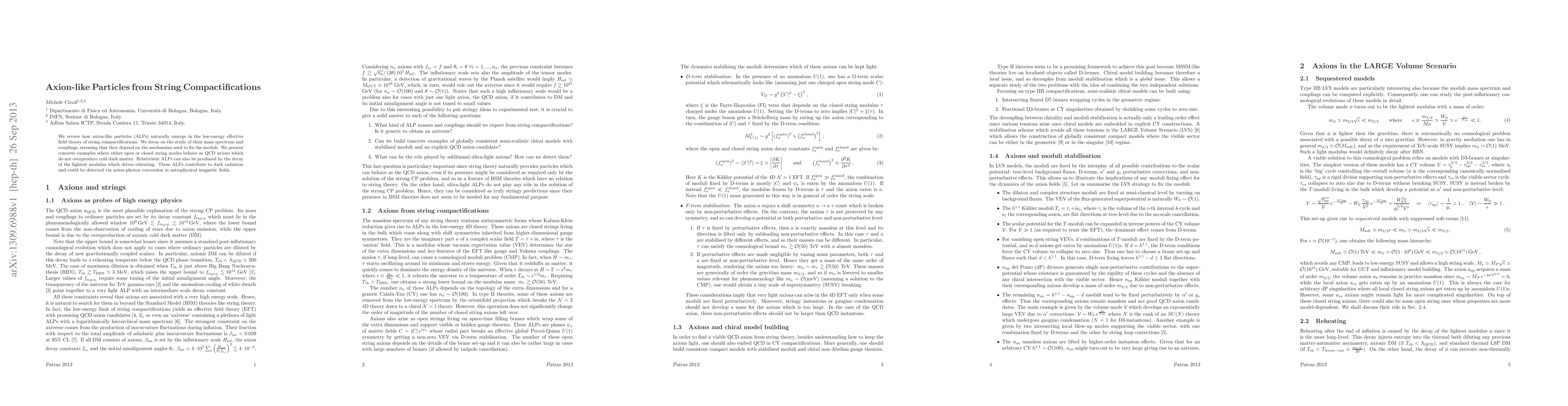 The paper presents a detailed analysis of how axion-like particles can arise from string compactifications, linking them to moduli stabilization mechanisms and their potential cosmological implications.