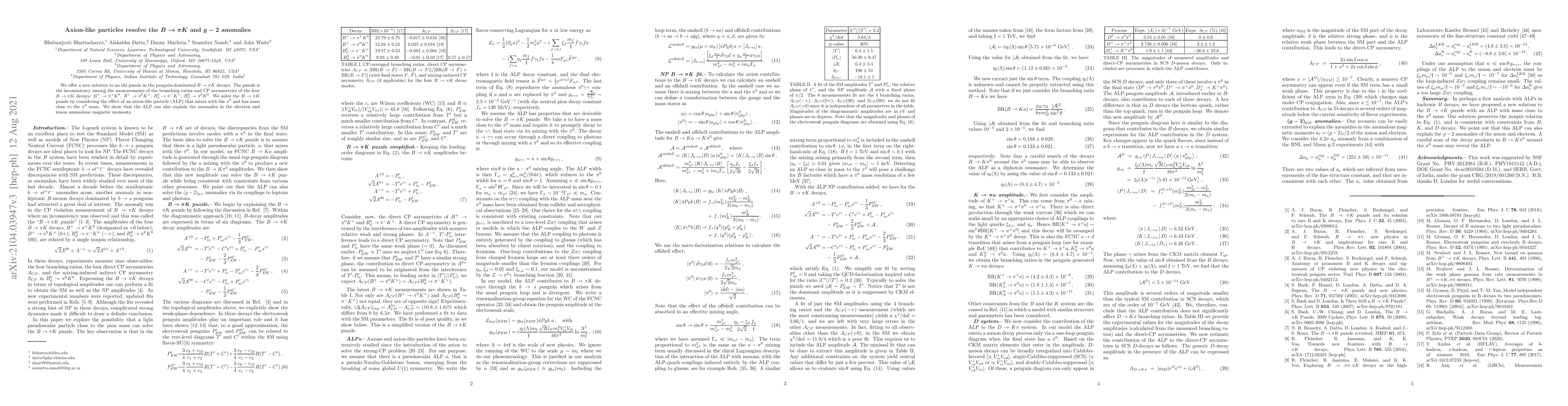 This paper proposes that axion-like particles (ALPs) can resolve inconsistencies in $B \to \pi K$ decay measurements and explain anomalies in the electron and muon anomalous magnetic moments. The ALPs mix with the $\pi^0$ and have a mass close to that of the $\pi^0$.