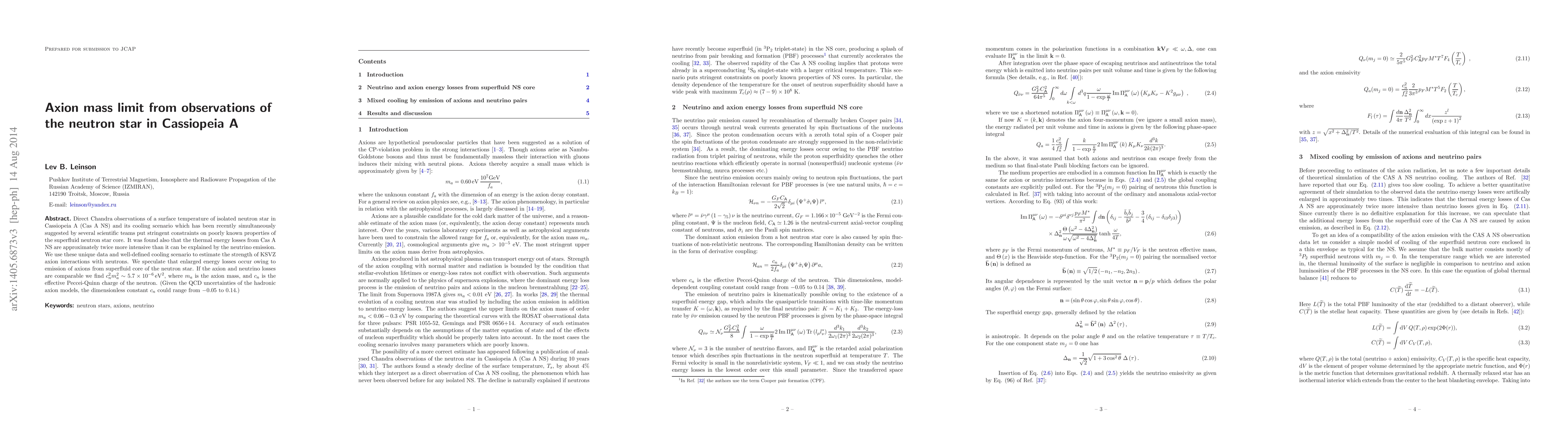 New observations of a neutron star in Cassiopeia A constrain axion properties, suggesting that axions may contribute to the star's cooling, with estimated interactions indicating $c_{n}^{2}m_{a}^{2} hickapprox 5.7 imes 10^{-6} ext{eV}^2$.