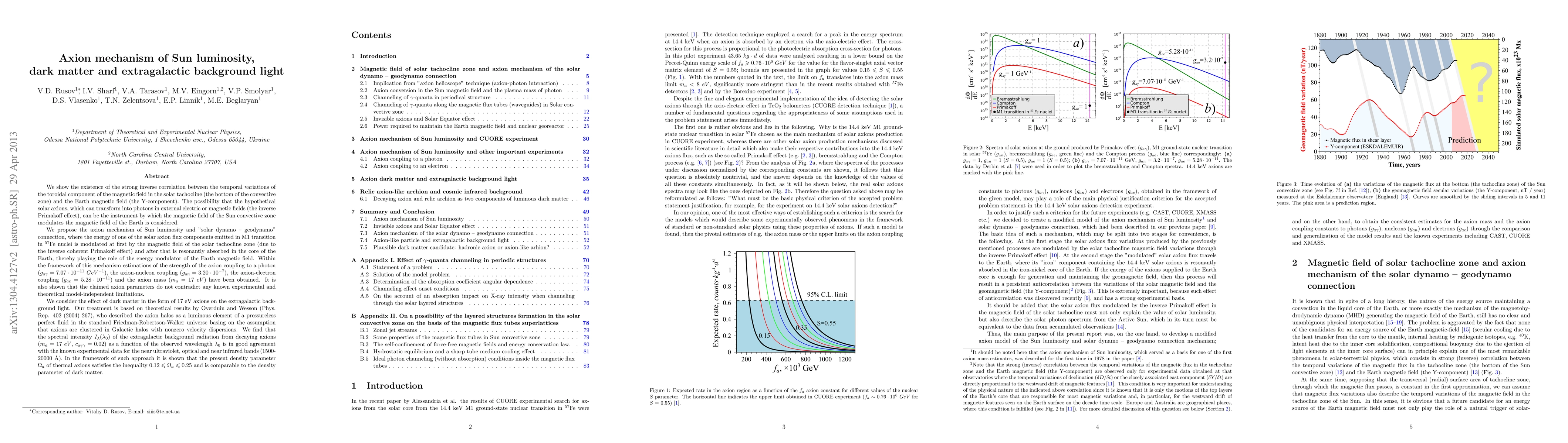 We show the existence of the strong inverse correlation between the temporal variations of the toroidal component of the magnetic field in the solar tachocline (the bottom of the convective zone) and the Earth magnetic field (the Y-component). The possibility that the hypothetical solar axions, which can transform into photons in external electric or magnetic fields (the inverse Primakoff effect), can be the instrument by which the magnetic field of the Sun convective zone modulates the magnetic field of the Earth is considered. We propose the axion mechanism of Sun luminosity and "solar dynamo -- geodynamo" connection, where the energy of one of the solar axion flux components emitted in M1 transition in 57Fe nuclei is modulated at first by the magnetic field of the solar tachocline zone (due to the inverse coherent Primakoff effect) and after that is resonantly absorbed in the core of the Earth, thereby playing the role of the energy modulator of the Earth magnetic field. Within the framework of this mechanism estimations of the strength of the axion coupling to a photon (g_{a \gamma} = 7.07e-11 1/GeV), the axion-nucleon coupling (g_{an} = 3.20e-7), the axion-electron coupling (g_{ae} = 5.28e-11) and the axion mass (m_a = 17eV) have been obtained. It is also shown that the claimed axion parameters do not contradict to any known experimental and theoretical model-independent limitations. We consider the effect of dark matter in the form of 17eV axions on the extragalactic back-ground light (EBL) and find that the theoretical spectral intensity of the EBL from decaying axions as a function of the observed wavelength is in good agreement with the known experimental data for the near ultraviolet, optical and near infrared bands (1500-20000 angstrom).