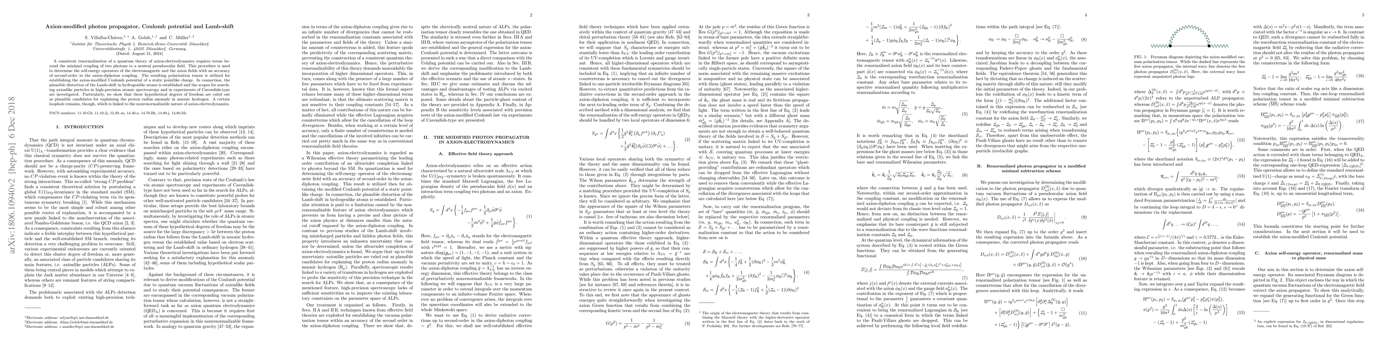 A consistent renormalization of a quantum theory of axion-electrodynamics requires terms beyond the minimal coupling of two photons to a neutral pseudoscalar field. This procedure is used to determine the self-energy operators of the electromagnetic and the axion fields with an accuracy of second-order in the axion-diphoton coupling. The resulting polarization tensor is utilized for establishing the axion-modified Coulomb potential of a static pointlike charge. In connection, the plausible distortion of the Lamb-shift in hydrogenlike atoms is established and the scopes for searching axionlike particles in high-precision atomic spectroscopy and in experiments of Cavendish-type are investigated. Particularly, we show that these hypothetical degrees of freedom are ruled out as plausible candidates for explaining the proton radius anomaly in muonic hydrogen. A certain loophole remains, though, which is linked to the nonrenormalizable nature of axion-electrodynamics.