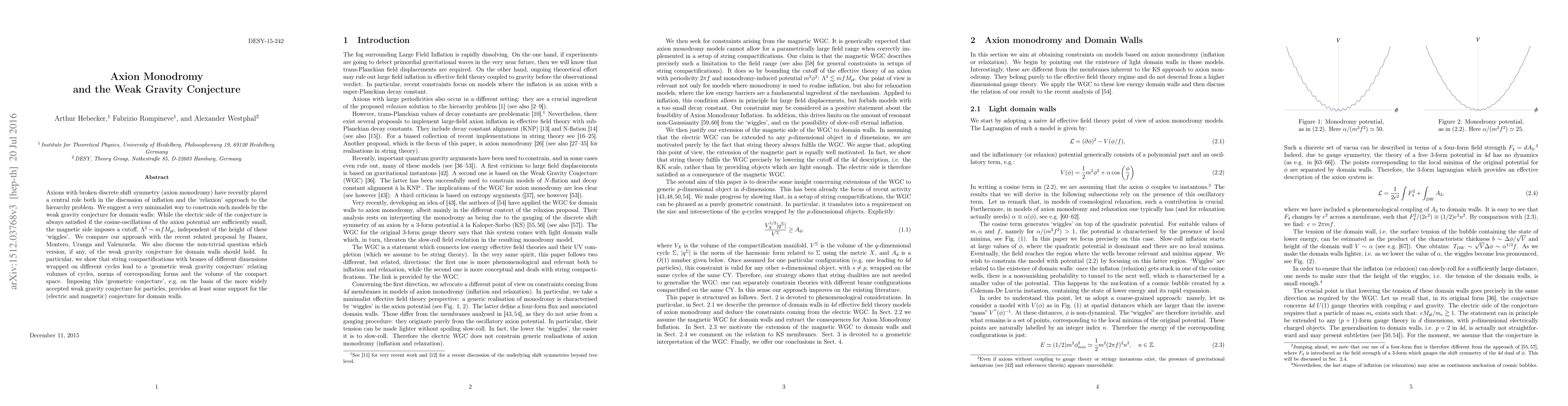 Axions with broken discrete shift symmetry (axion monodromy) have recently played a central role both in the discussion of inflation and the `relaxion' approach to the hierarchy problem. We suggest a very minimalist way to constrain such models by the weak gravity conjecture for domain walls: While the electric side of the conjecture is always satisfied if the cosine-oscillations of the axion potential are sufficiently small, the magnetic side imposes a cutoff, $\Lambda^3 \sim m f M_{pl}$, independent of the height of these `wiggles'. We compare our approach with the recent related proposal by Ibanez, Montero, Uranga and Valenzuela. We also discuss the non-trivial question which version, if any, of the weak gravity conjecture for domain walls should hold. In particular, we show that string compactifications with branes of different dimensions wrapped on different cycles lead to a `geometric weak gravity conjecture' relating volumes of cycles, norms of corresponding forms and the volume of the compact space. Imposing this `geometric conjecture', e.g.~on the basis of the more widely accepted weak gravity conjecture for particles, provides at least some support for the (electric and magnetic) conjecture for domain walls.