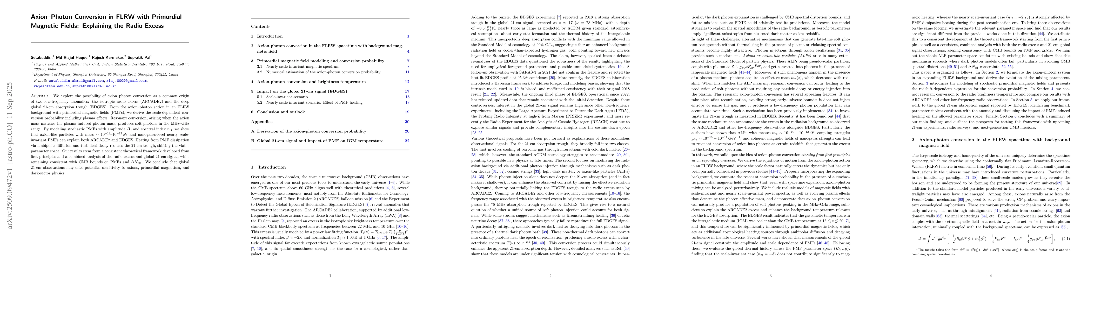 We explore the possibility of axion-photon conversion as a common origin of two low-frequency anomalies: the isotropic radio excess (ARCADE2) and the deep global 21-cm absorption trough (EDGES). From the axion-photon action in an FLRW background with primordial magnetic fields (PMFs), we derive the scale-dependent conversion probability including plasma effects. Resonant conversion, arising when the axion mass matches the plasma-induced photon mass, produces soft photons in the MHz-GHz range. By modeling stochastic PMFs with amplitude $B_0$ and spectral index $n_{\rm B}$, we show that axion-like particles with mass $\sim 10^{-14}$-$10^{-12}\,\mathrm{eV}$ and nanogauss-level nearly scale invariant PMFs can explain both ARCADE2 and EDGES. Heating from PMF dissipation via ambipolar diffusion and turbulent decay reduces the 21-cm trough, shifting the viable parameter space. Our results stem from a consistent theoretical framework developed from first principles and a combined analysis of the radio excess and global 21-cm signal, while remaining consistent with CMB bounds on PMFs and $\Delta N_{\rm eff}$. We conclude that global 21-cm observations may offer potential sensitivity to axions, primordial magnetism, and dark-sector physics.