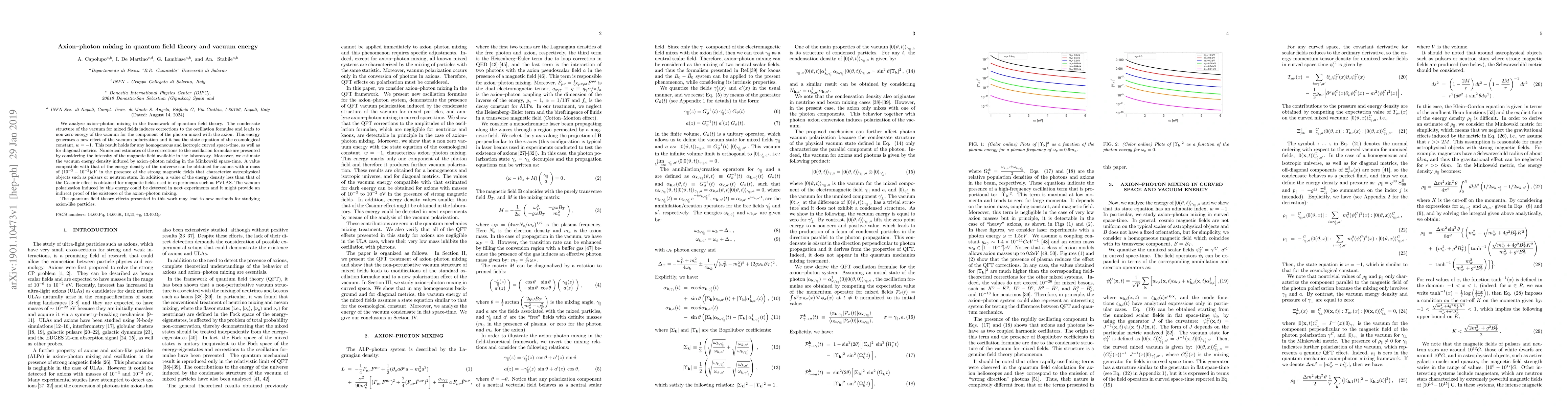 We analyze axion--photon mixing in the framework of quantum field theory. The condensate structure of the vacuum for mixed fields induces corrections to the oscillation formulae and leads to non-zero energy of the vacuum for the component of the photon mixed with the axion. This energy generates a new effect of the vacuum polarization and it has the state equation of the cosmological constant, $w = -1$. This result holds for any homogeneous and isotropic curved space-time, as well as for diagonal metrics. Numerical estimates of the corrections to the oscillation formulae are presented by considering the intensity of the magnetic field available in the laboratory. Moreover, we estimate the vacuum energy density induced by axion--photon mixing in the Minkowski space-time. A value compatible with that of the energy density of the universe can be obtained for axions with a mass of $(10^{-3}-10^{-2}) eV$ in the presence of the strong magnetic fields that characterize astrophysical objects such as pulsars or neutron stars. In addition, a value of the energy density less than that of the Casimir effect is obtained for magnetic fields used in experiments such as PVLAS. The vacuum polarization induced by this energy could be detected in next experiments and it might provide an indirect proof of the existence of the axion--photon mixing. The quantum field theory effects presented in this work may lead to new methods for studying axion-like particles.