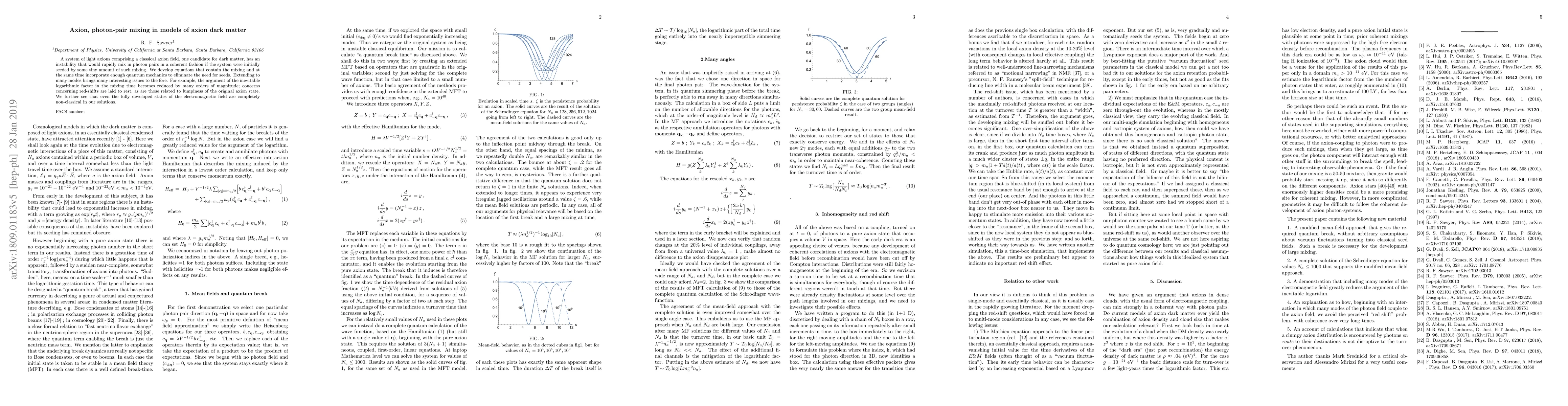 A system of light axions comprising a classical axion field, one candidate for dark matter, has an instability that would rapidly mix in photon pairs in a coherent fashion if the system were initially seeded by some tiny amount of such mixing. We develop equations that contain the mixing and at the same time incorporate enough quantum mechanics to eliminate the need for seeds. Extending to many modes brings many interesting issues to the fore. For example, the argument of the inevitable logarithmic factor in the mixing time becomes reduced by many orders of magnitude; concerns concerning red-shifts are laid to rest, as are those related to lumpiness of the original axion state. We further see that even the fully developed states of the electromagnetic field are completely non-classical in our solutions.