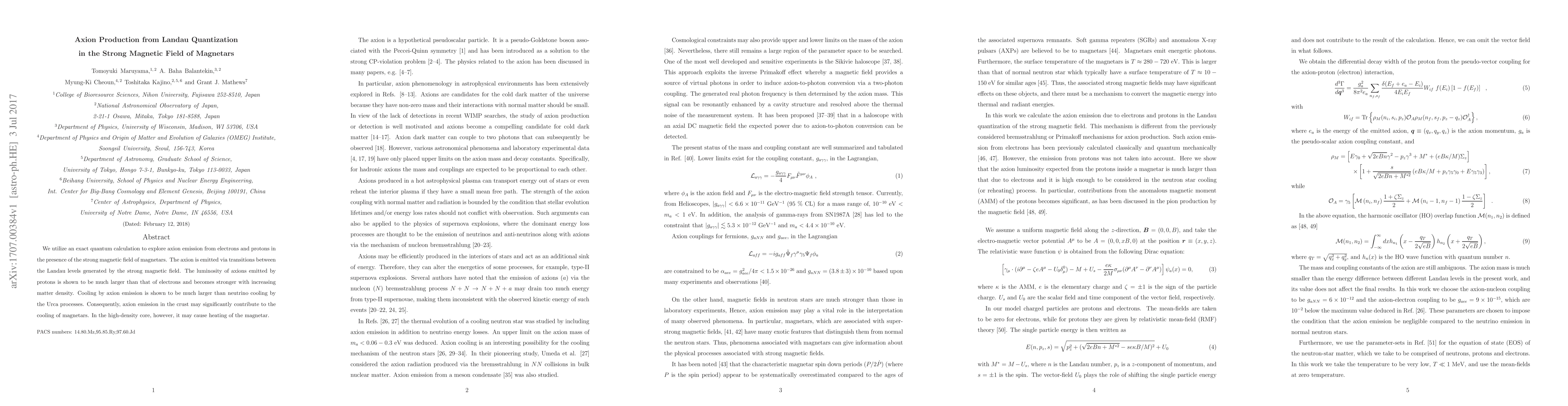 This paper investigates axion production from Landau quantization in magnetars' strong magnetic fields, revealing that proton-induced axion emission is significantly more luminous than electron-induced emission. Axion emission may play a crucial role in magnetar cooling in the crust but could lead to heating in the high-density core.