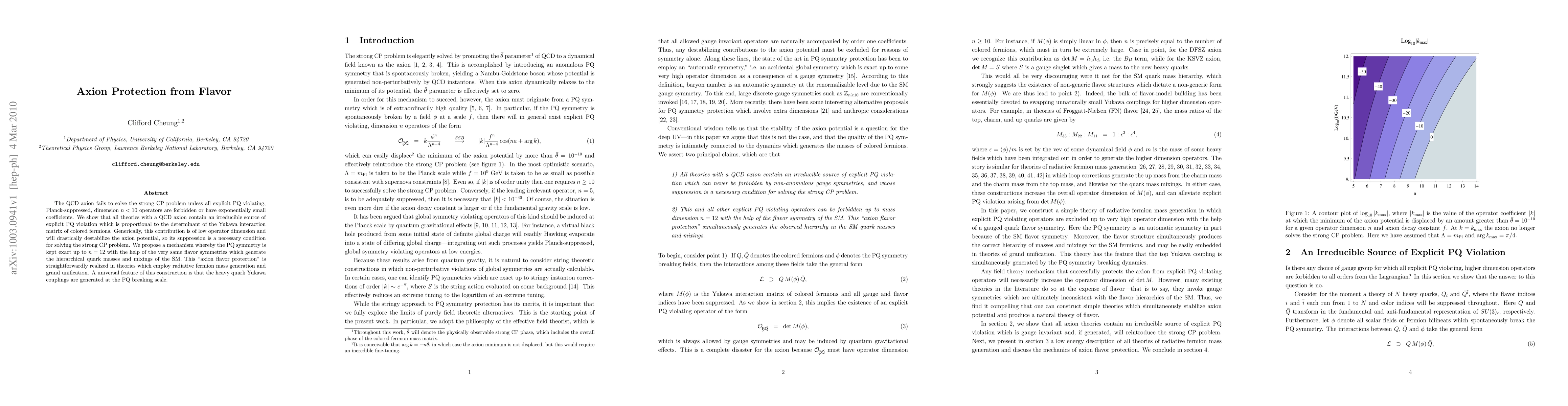 Summary: The paper discusses the challenges in solving the strong CP problem with the QCD axion and proposes a mechanism called "axion flavor protection" to suppress explicit PQ violations. This protection leverages flavor symmetries to maintain the PQ symmetry up to high dimensions, ensuring the axion potential remains stable.