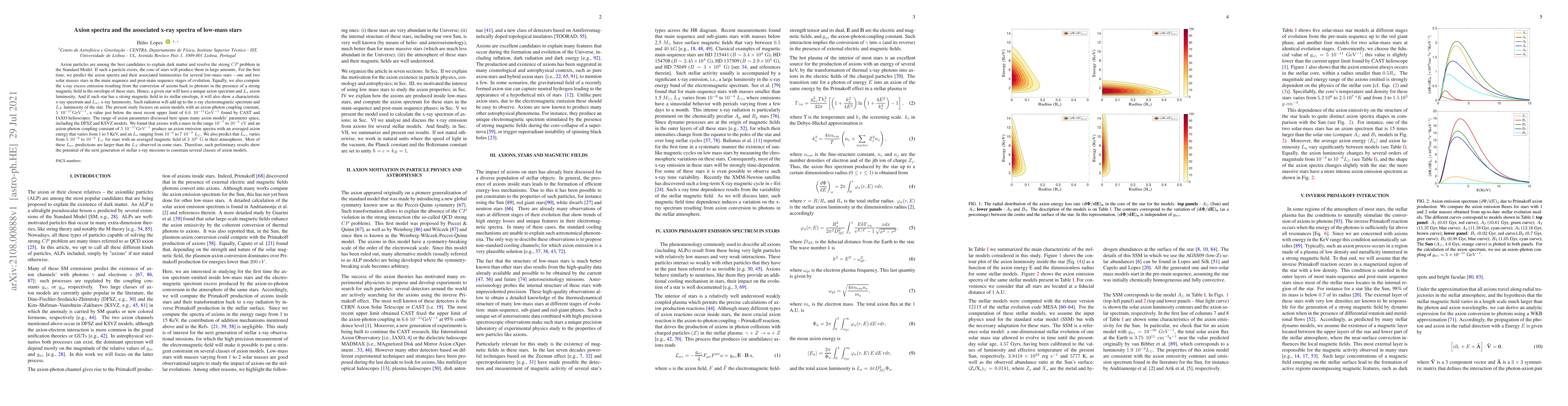For the first time, we predict the axion spectra and their associated luminosities for several low-mass stars -- one and two solar masses stars in the main sequence and post-main sequence stages of evolution. Equally, we also compute the x-ray excess emission resulting from the conversion of axions back to photons in the presence of a strong magnetic field in the envelope of these stars. Hence, a given star will have a unique axion spectrum and $L_a$ axion luminosity. And if such star has a strong magnetic field in its stellar envelope, it will also show a characteristic x-ray spectrum and $L_{a\gamma}$ x-ray luminosity. Such radiation will add up to the x-ray electromagnetic spectrum and $L_X$ luminosity of the star. The present study focuses on axion models with an axion-photon coupling constant, $5\;10^{-11} {\rm GeV}^{-1}$, a value just below the most recent upper limit of $6.6\;10^{-11} {\rm GeV}^{-1}$ found by CAST and IAXO helioscopes. The range of axion parameters discussed here spans many axion models' parameter space, including the DFSZ and KSVZ models. We found that axions with a mass in the range $10^{-7}$ to $10^{-5}\; {\rm eV}$ and an axion-photon coupling constant of $5\;10^{-11} {\rm GeV}^{-1}$ produce an axion emission spectra with an averaged axion energy that varies from 1 to 5 KeV, and an $L_{a}$ ranging from $10^{-6} $ to $7\;10^{-3} \;L_\odot$. We also predict that $L_{a\gamma}$ varies from $5\;10^{-8}$ to $10^{-5} \;L_\odot$ for stars with an averaged magnetic field of $3 \;10^{4}\;{\rm G}$ in their atmospheres. Most of these $L_{a\gamma}$ predictions are larger than the $L_X$ observed in some stars. Therefore, such preliminary results show the potential of the next generation of stellar x-ray missions to constrain several classes of axion models.
