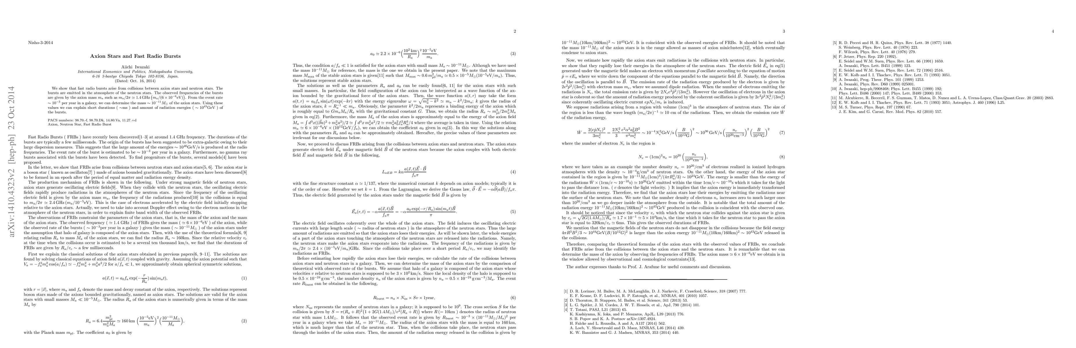 Summary: Fast radio bursts originate from collisions between axion stars and neutron stars, emitting bursts in the neutron star atmospheres with frequencies determined by the axion mass. The calculated event rate and axion star mass provide an explanation for the bursts' short durations and high energy outputs.