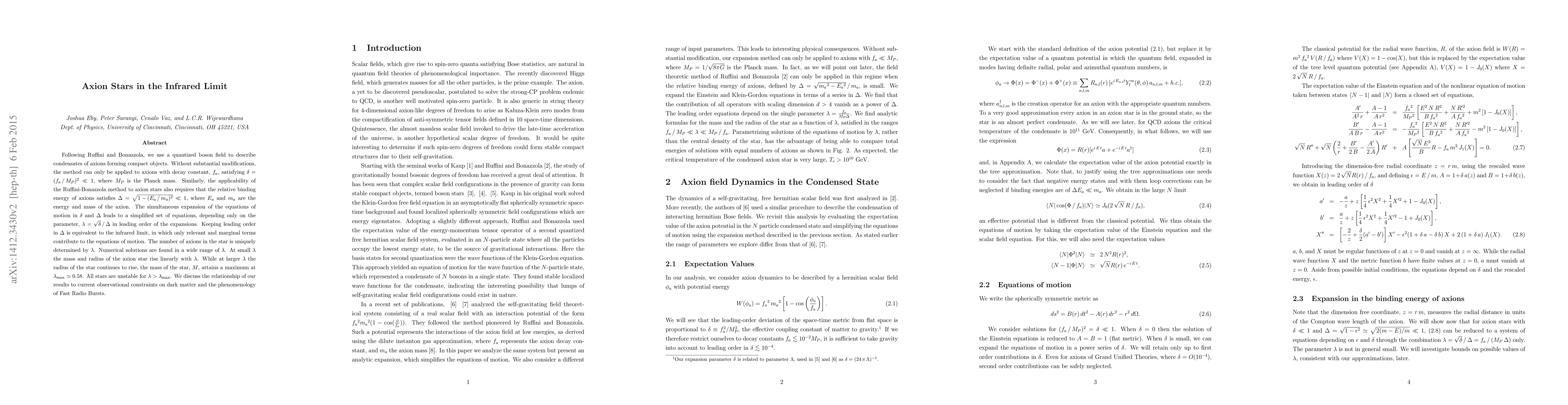 Following Ruffini and Bonazzola, we use a quantized boson field to describe condensates of axions forming compact objects. Without substantial modifications, the method can only be applied to axions with decay constant, $f_a$, satisfying $\delta=(f_a\,/\,M_P)^2\ll 1$, where $M_P$ is the Planck mass. Similarly, the applicability of the Ruffini-Bonazzola method to axion stars also requires that the relative binding energy of axions satisfies $\Delta=\sqrt{1-(E_a\,/\,m_a)^2}\ll1$, where $E_a$ and $m_a$ are the energy and mass of the axion. The simultaneous expansion of the equations of motion in $\delta$ and $\Delta$ leads to a simplified set of equations, depending only on the parameter, $\lambda=\sqrt{\delta}\,/\,\Delta$ in leading order of the expansions. Keeping leading order in $\Delta$ is equivalent to the infrared limit, in which only relevant and marginal terms contribute to the equations of motion. The number of axions in the star is uniquely determined by $\lambda$. Numerical solutions are found in a wide range of $\lambda$. At small $\lambda$ the mass and radius of the axion star rise linearly with $\lambda$. While at larger $\lambda$ the radius of the star continues to rise, the mass of the star, $M$, attains a maximum at $\lambda_{\rm max}\simeq 0.58$. All stars are unstable for $\lambda>\lambda_{\rm max}$ . We discuss the relationship of our results to current observational constraints on dark matter and the phenomenology of Fast Radio Bursts.