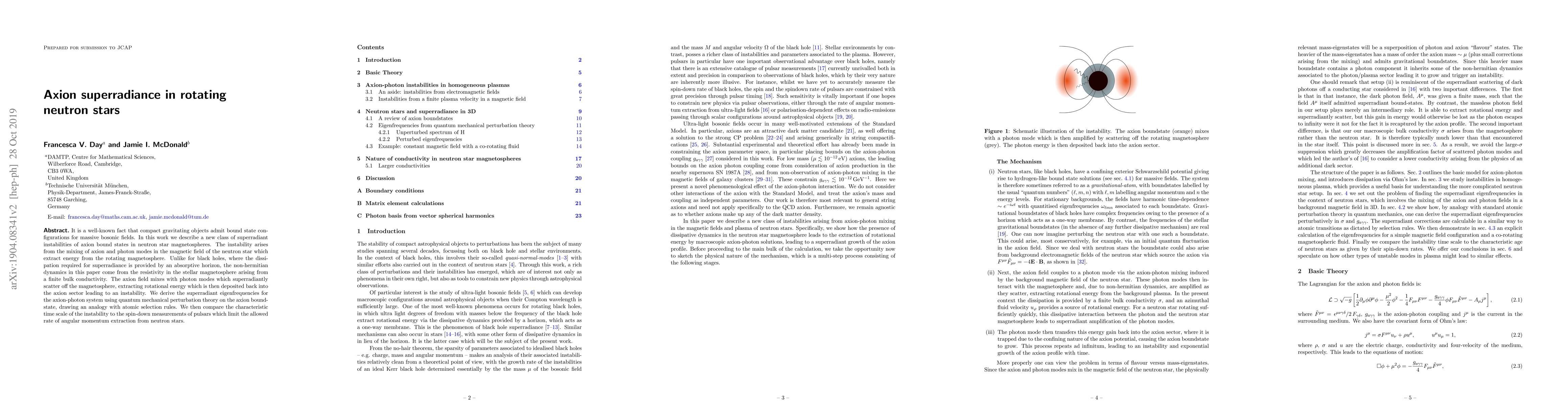 This paper explores a new superradiant instability in rotating neutron stars due to the interaction between axions and photons in the star's magnetic field, leading to energy extraction from the star's rotation. Unlike black holes, this instability is driven by the resistivity in the neutron star's magnetosphere, rather than an event horizon.