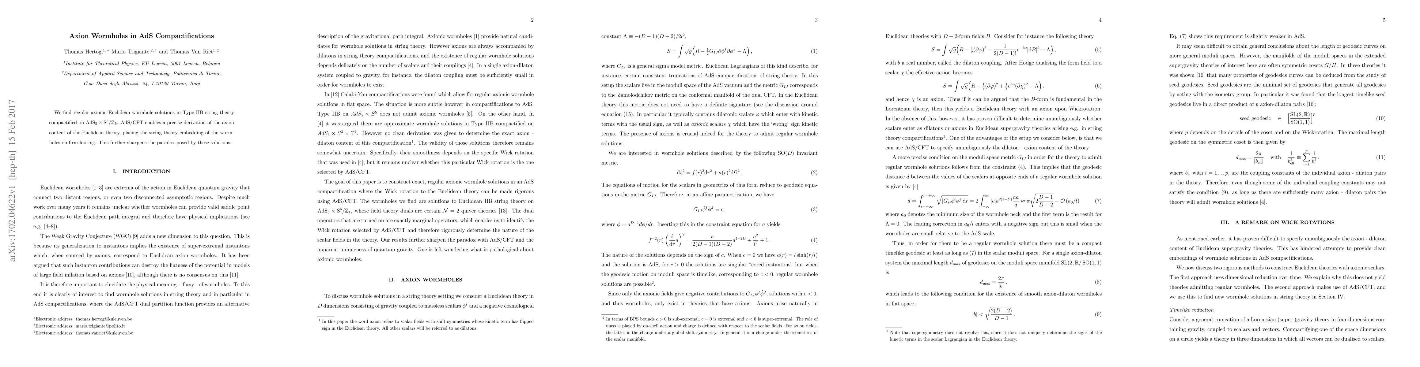 The paper discovers stable axion wormhole solutions in Type IIB string theory within $\text{AdS}_5\times \text{S}^5/\mathbb{Z}_k$ compactifications, supported by AdS/CFT correspondence, which clarifies the wormholes' axion content and intensifies the paradox they present.