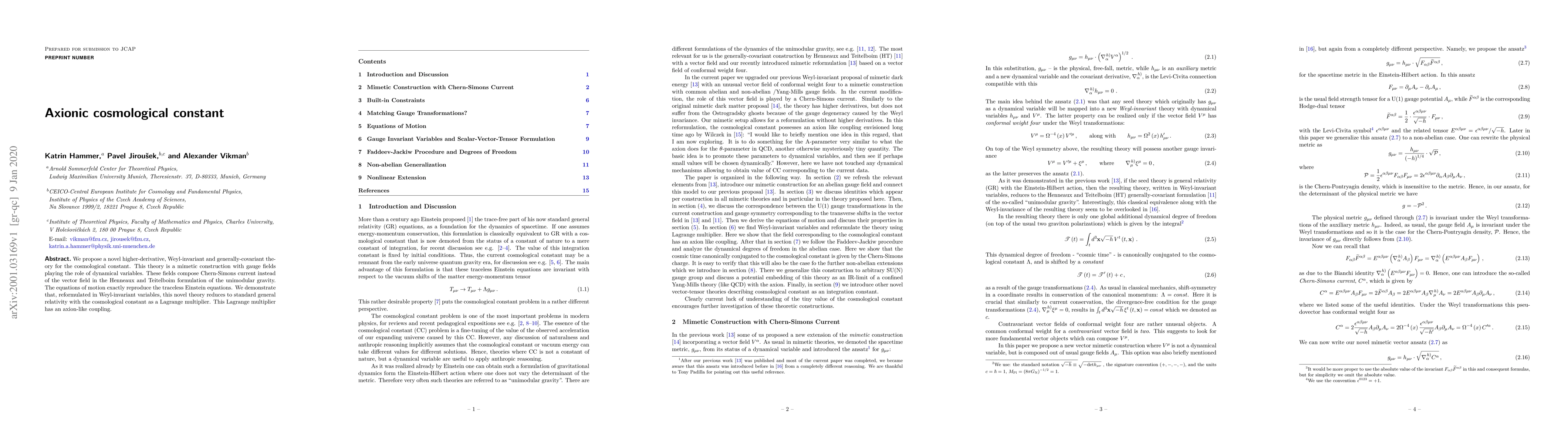 We propose a novel, higher-derivative, Weyl-invariant and generally-covariant theory for the cosmological constant. This theory is a mimetic construction with gauge fields playing the role of dynamical variables. These fields compose the Chern-Simons current instead of the vector field used in the Henneaux and Teitelboim formulation of the unimodular gravity. The equations of motion exactly reproduce the traceless Einstein equations. We demonstrate that, reformulated in Weyl-invariant variables, this novel theory reduces to standard general relativity with the cosmological constant as a Lagrange multiplier. This Lagrange multiplier has an axion-like coupling.
