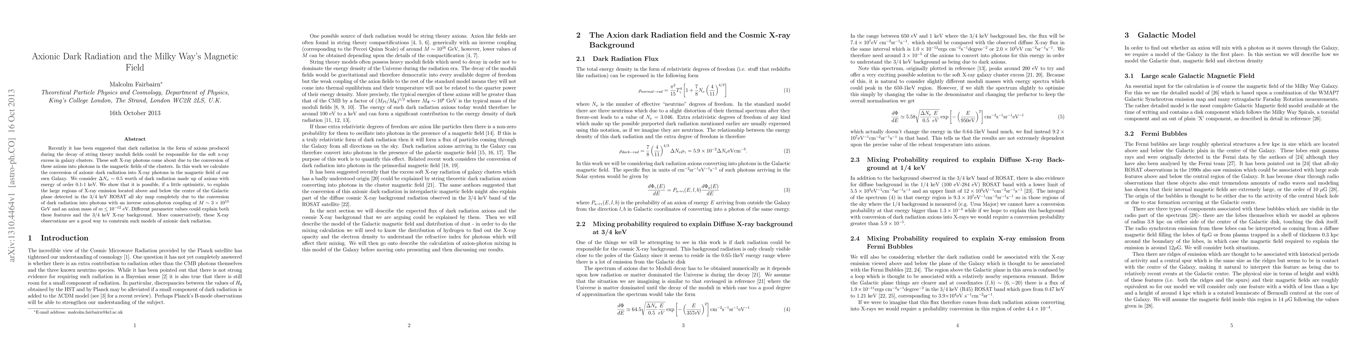 This paper explores the potential role of axionic dark radiation in explaining the Milky Way's magnetic field-induced X-ray emissions, suggesting that axions from string theory moduli fields could convert into X-ray photons, potentially explaining the observed 3/4 keV X-ray excess. It concludes that while optimistic, this model could account for the detected X-ray emissions, and more conservatively, provides constraints on axion-photon coupling and axion mass.