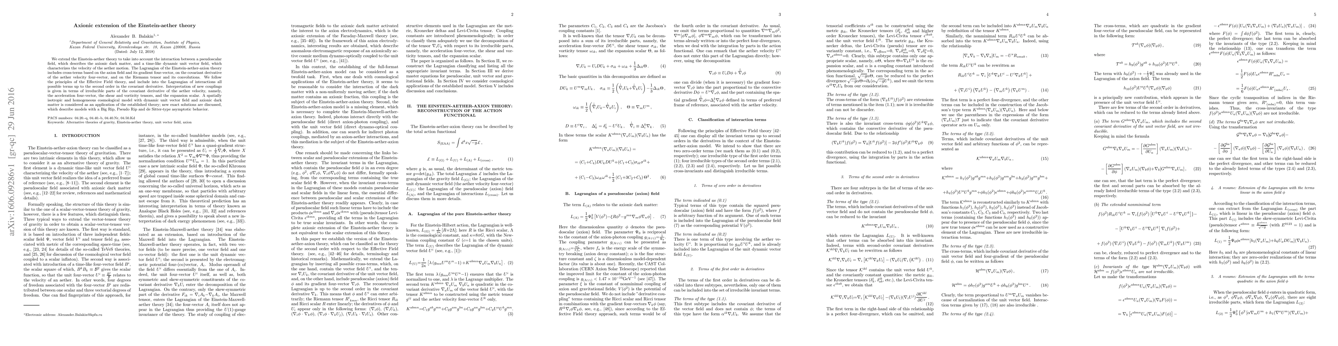This paper extends the Einstein-aether theory to incorporate an axionic dark matter pseudoscalar field, introducing new cross-terms in the Lagrangian. It explores cosmological models with dynamic unit vector fields and axions, yielding new exact solutions including Big Rip, Pseudo Rip, and de Sitter-type behaviors.