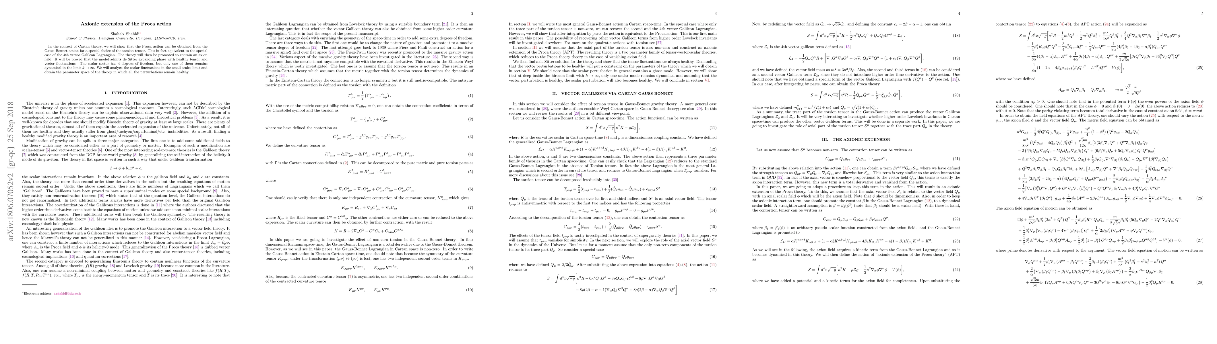 In the context of Cartan theory, we will show that the Proca action can be obtained from the Gauss-Bonnet action for a special choice of the torsion tensor. This in fact equivalent to the special case of the 4th vector Galileon Lagrangian. The theory will then be promoted to contain an axion field. It will be proved that the model admits de Sitter expanding phase with healthy tensor and vector fluctuations. The scalar sector has 4 degrees of freedom, but only one of them remains dynamical in the limit $k\rightarrow\infty$. We will analyze the scalar fluctuations in the small scales limit and obtain the parameter space of the theory in which all the perturbations remain healthy.