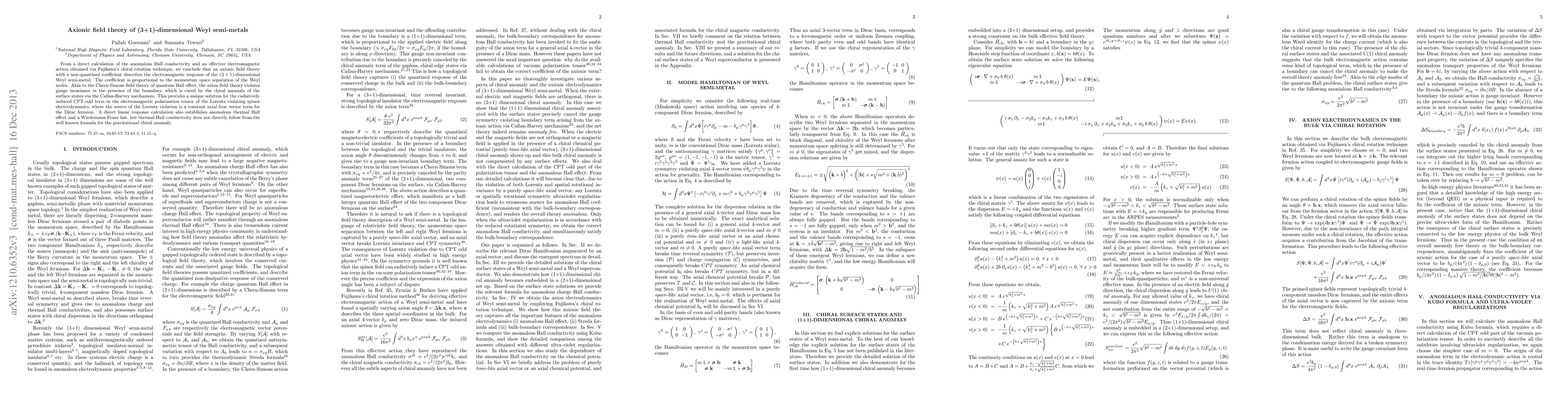 From a direct calculation of the anomalous Hall conductivity and an effective electromagnetic action obtained via Fujikawa's chiral rotation technique, we conclude that an axionic field theory with a non-quantized coefficient describes the electromagnetic response of the $(3+1)$-dimensional Weyl semi-metal. The coefficient is proportional to the momentum space separation of the Weyl nodes. Akin to the Chern-Simons field theory of quantum Hall effect, the axion field theory violates gauge invariance in the presence of the boundary, which is cured by the chiral anomaly of the surface states via the Callan-Harvey mechanism. This provides a unique solution for the radiatively induced CPT-odd term in the electromagnetic polarization tensor of the Lorentz violating spinor electrodynamics, where the source of the Lorentz violation is a constant axial four vector term for the Dirac fermion. A direct linear response calculation also establishes anomalous thermal Hall effect and a Wiedemann-Franz law, but thermal Hall conductivity does not directly follow from the well known formula for the gravitational chiral anomaly.