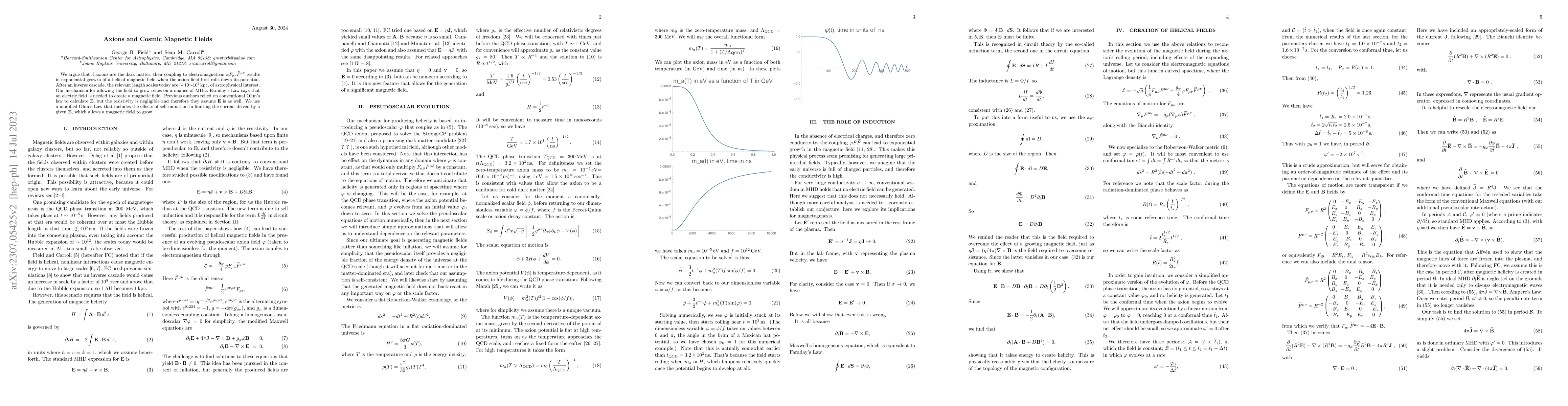 We argue that if axions are the dark matter, their coupling to electromagnetism results in exponential growth of a helical magnetic field when the axion field first rolls down its potential. After an inverse cascade, the relevant length scales to day are of order 10-100 kpc, of astrophysical interest. Our mechanism for allowing the field to grow relies on a nuance of MHD. Faraday's Law says that an electric field is needed to create a magnetic field. Previous authors relied on conventional Ohm's law to calculate E, but the resistivity is negligible and therefore they assume E is as well. We use a modified Ohm's Law that includes the effects of self-induction in limiting the current driven by a given E, which allows a magnetic field to grow.
