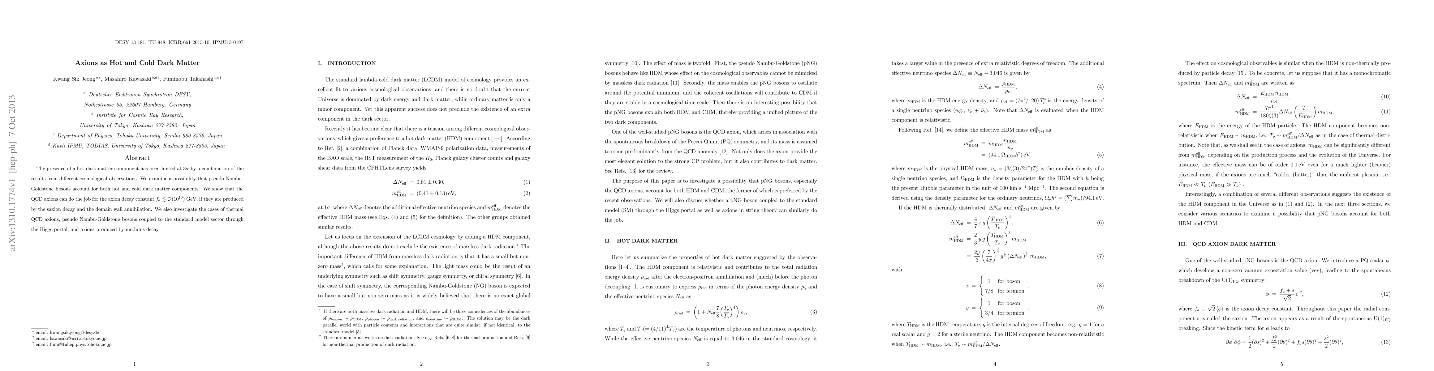 This paper explores if QCD axions, as pseudo Nambu-Goldstone bosons, can simultaneously serve as both hot and cold dark matter components, suggesting production mechanisms through saxion decay, domain wall annihilation, thermal processes, Higgs portal coupling, and modulus decay. The study finds that axions with decay constants below O(10^10) GeV can fulfill these roles.