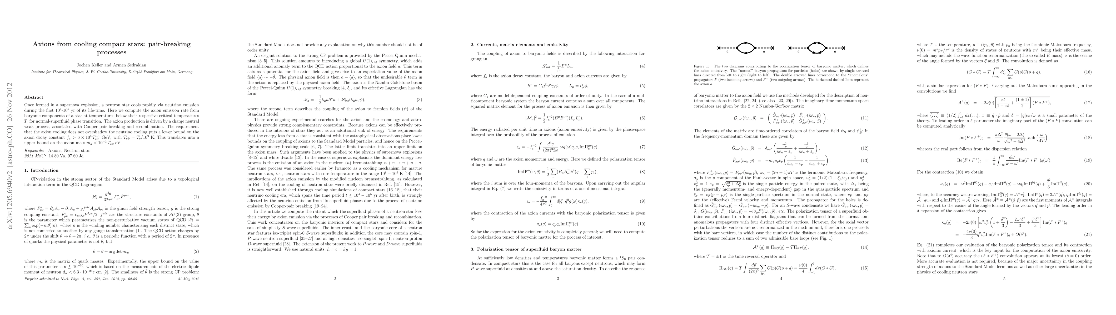 Once formed in a supernova explosion, a neutron star cools rapidly via neutrino emission during the first 10^4-10^5 yr of its life-time. Here we compute the axion emission rate from baryonic components of a star at temperatures below their respective critical temperatures T_c for normal-superfluid phase transition. The axion production is driven by a charge neutral weak process, associated with Cooper pair breaking and recombination. The requirement that the axion cooling does not overshadow the neutrino cooling puts a lower bound on the axion decay constant f_a > 6 10^9 T_{c9}^{-1} GeV, with T_{c9} = T_c/10^9 K. This translates into a upper bound on the axion mass m_a < 10^{-3} T_{c9} eV.