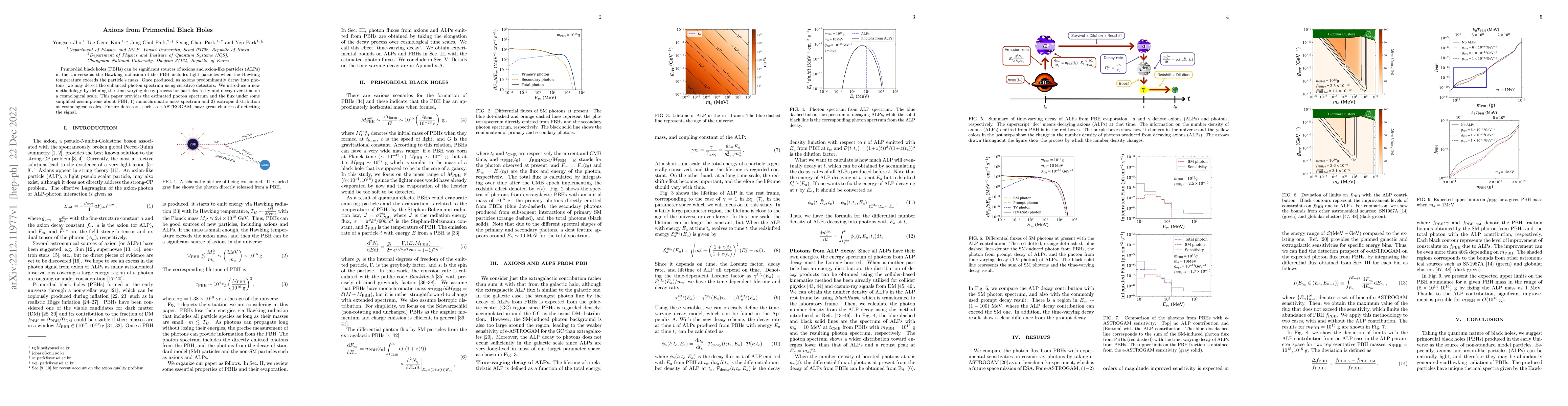 This paper explores the potential for primordial black holes to emit axions via Hawking radiation, proposing a new methodology to model the time-varying decay of these particles into photons. It estimates the resulting photon spectrum and flux under simplified assumptions, suggesting future detectors like e-ASTROGAM could detect the signal.