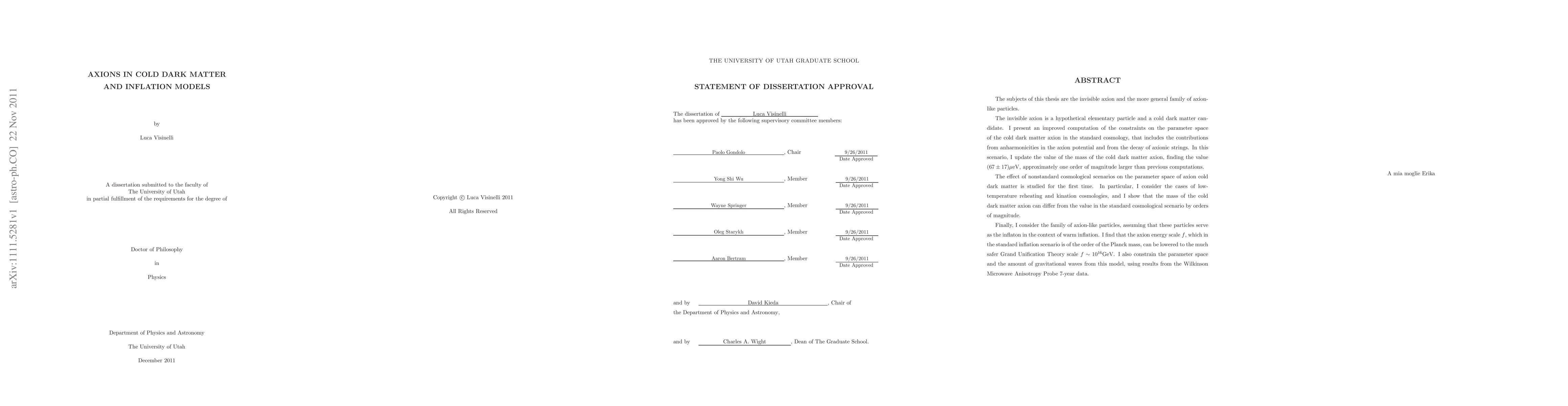 This paper investigates the invisible axion as a cold dark matter candidate, updating its mass to $(67\pm17){\rm \mu eV}$ and exploring its parameter space under nonstandard cosmological scenarios. It also explores axion-like particles as inflatons in warm inflation models, lowering the axion energy scale to the Grand Unification Theory scale and constraining the resulting gravitational waves.