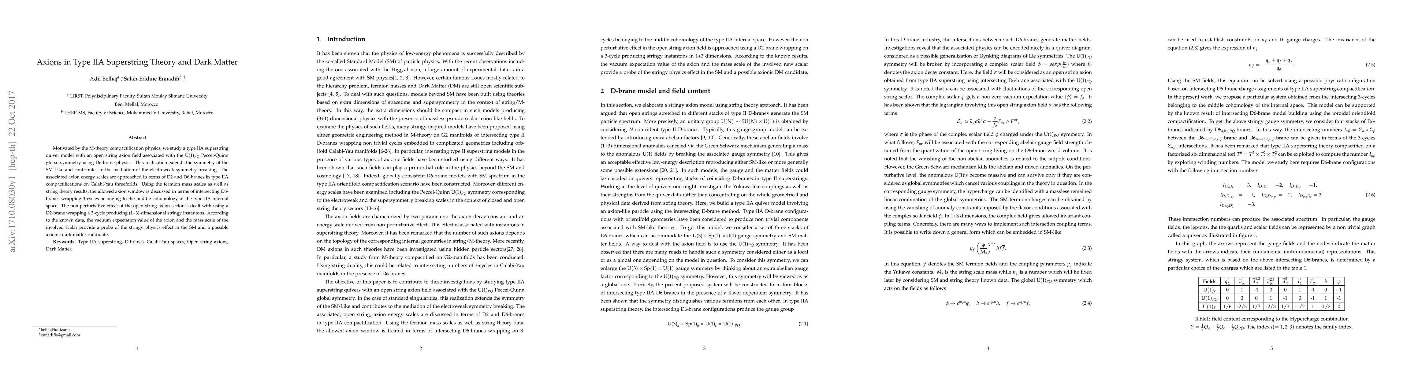 This paper explores a type IIA superstring theory model with an open string axion field, investigating its implications for electroweak symmetry breaking and potential axion dark matter. The study uses D6-brane physics and compactification on Calabi-Yau threefolds to determine the axion's energy scales and its role in string theory.
