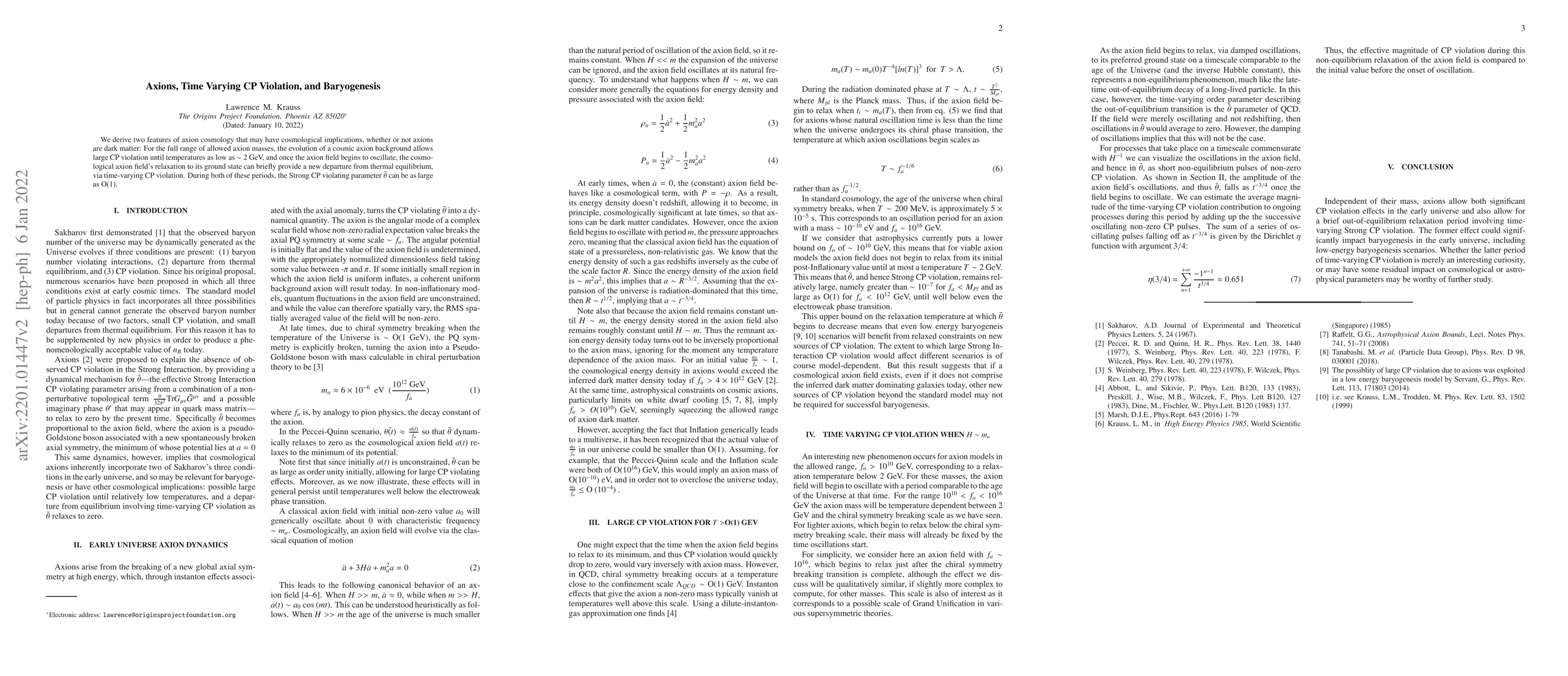 The paper presents detailed calculations of axion dynamics and their cosmological implications, particularly focusing on the time-varying CP violation during axion field relaxation.