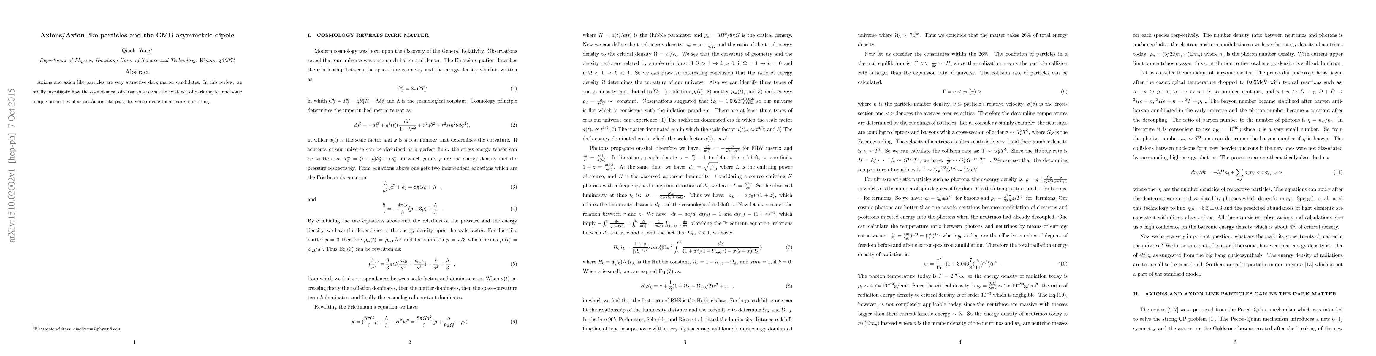 Summary: This review explores the potential of axions and axion-like particles as dark matter candidates and investigates how cosmological observations, particularly the CMB asymmetric dipole, provide insights into their unique properties. The study underscores the compelling nature of these particles in explaining dark matter phenomena.