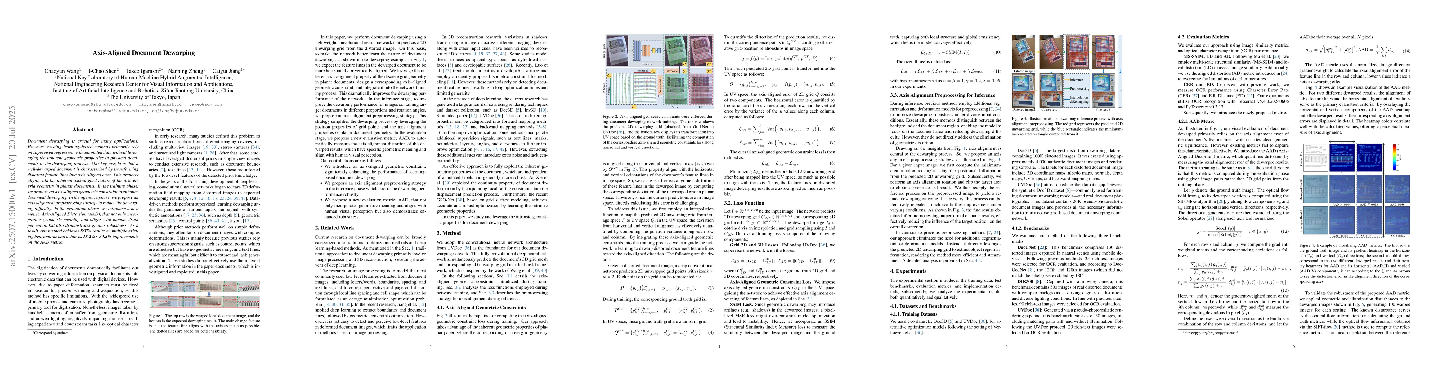 Document dewarping is crucial for many applications. However, existing learning-based methods primarily rely on supervised regression with annotated data without leveraging the inherent geometric properties in physical documents to the dewarping process. Our key insight is that a well-dewarped document is characterized by transforming distorted feature lines into axis-aligned ones. This property aligns with the inherent axis-aligned nature of the discrete grid geometry in planar documents. In the training phase, we propose an axis-aligned geometric constraint to enhance document dewarping. In the inference phase, we propose an axis alignment preprocessing strategy to reduce the dewarping difficulty. In the evaluation phase, we introduce a new metric, Axis-Aligned Distortion (AAD), that not only incorporates geometric meaning and aligns with human visual perception but also demonstrates greater robustness. As a result, our method achieves SOTA results on multiple existing benchmarks and achieves 18.2%~34.5% improvements on the AAD metric.