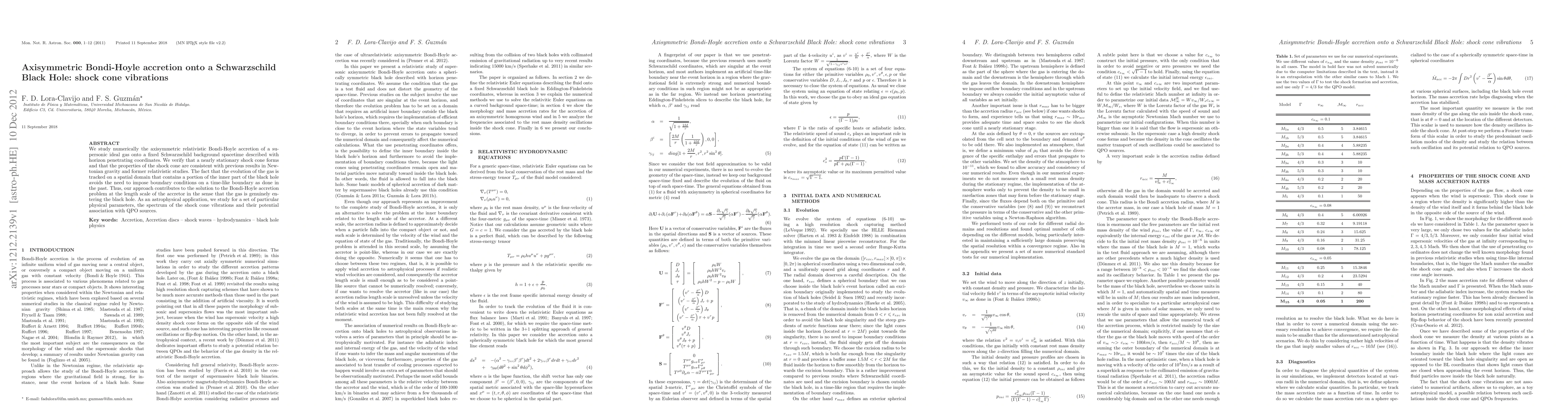This paper investigates the axisymmetric relativistic Bondi-Hoyle accretion process onto a Schwarzschild black hole, demonstrating the formation of a nearly stationary shock cone and its consistency with previous studies. The numerical approach allows for the gas to enter the black hole without imposing boundary conditions, potentially linking shock cone vibrations to quasi-periodic oscillations (QPO) in astrophysical contexts.