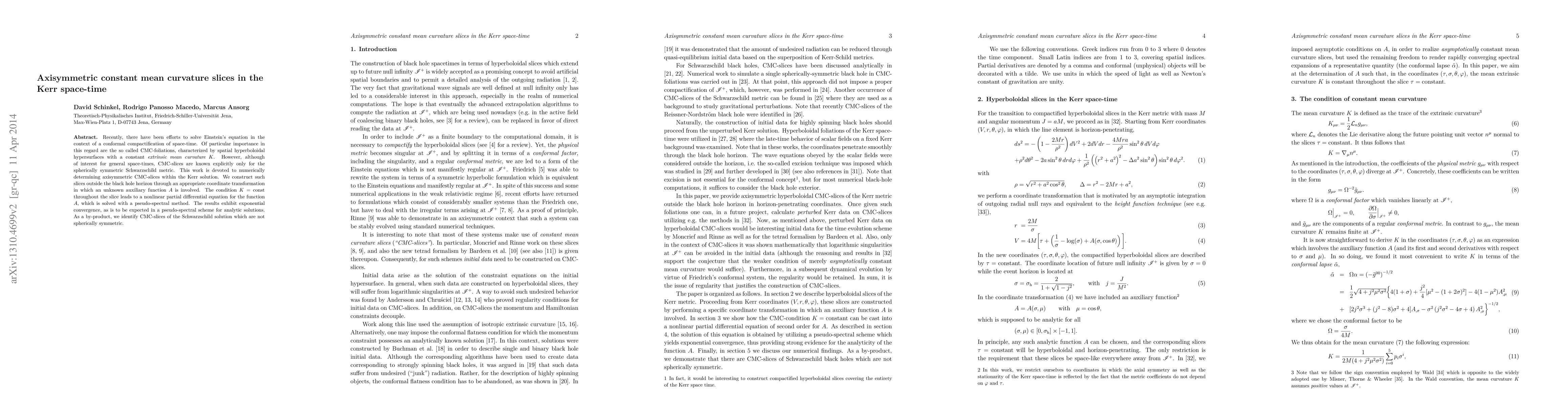 Recently, there have been efforts to solve Einstein's equation in the context of a conformal compactification of space-time. Of particular importance in this regard are the so called CMC-foliations, characterized by spatial hyperboloidal hypersurfaces with a constant extrinsic mean curvature K. However, although of interest for general space-times, CMC-slices are known explicitly only for the spherically symmetric Schwarzschild metric. This work is devoted to numerically determining axisymmetric CMC-slices within the Kerr solution. We construct such slices outside the black hole horizon through an appropriate coordinate transformation in which an unknown auxiliary function A is involved. The condition K=const. throughout the slice leads to a nonlinear partial differential equation for the function A, which is solved with a pseudo-spectral method. The results exhibit exponential convergence, as is to be expected in a pseudo-spectral scheme for analytic solutions. As a by-product, we identify CMC-slices of the Schwarzschild solution which are not spherically symmetric.
