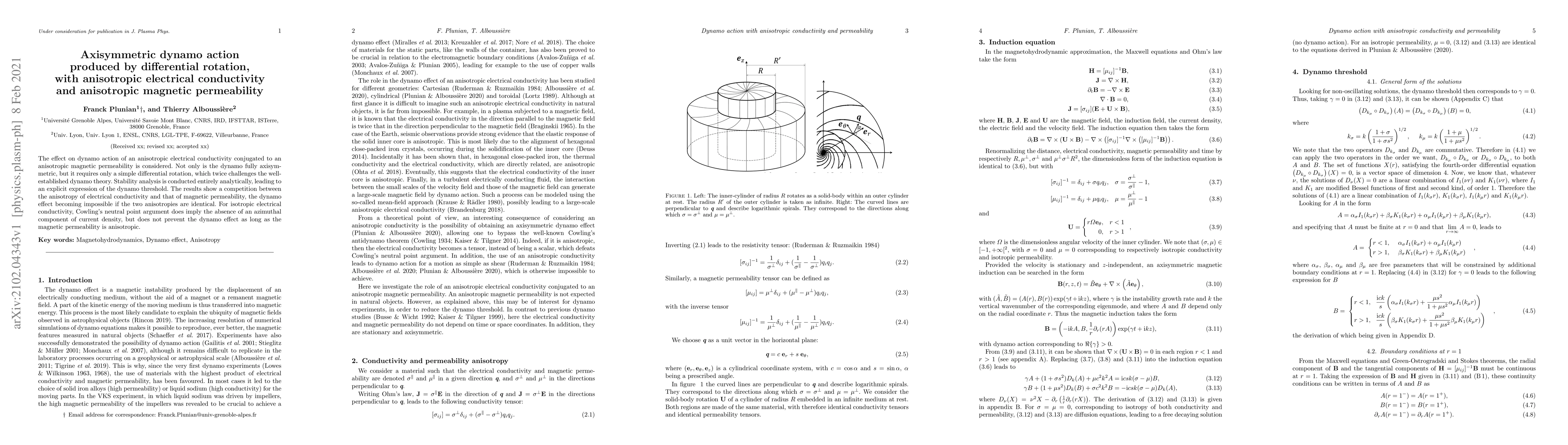 The effect on dynamo action of an anisotropic electrical conductivity conjugated to an anisotropic magnetic permeability is considered. Not only is the dynamo fully axisymmetric, but it requires only a simple differential rotation, which twice challenges the well-established dynamo theory. Stability analysis is conducted entirely analytically, leading to an explicit expression of the dynamo threshold. The results show a competition between the anisotropy of electrical conductivity and that of magnetic permeability, the dynamo effect becoming impossible if the two anisotropies are identical. For isotropic electrical conductivity, Cowling's neutral point argument does imply the absence of an azimuthal component of current density, but does not prevent the dynamo effect as long as the magnetic permeability is anisotropic.
