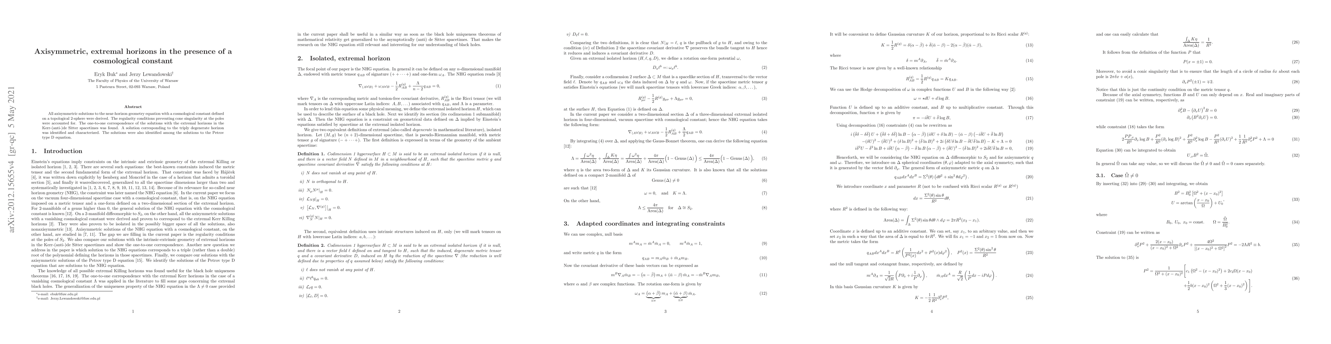 The paper derives all axisymmetric solutions for near-horizon geometry with a cosmological constant on a topological 2-sphere, ensuring no pole singularities. It establishes a one-to-one correspondence with extremal horizons in Kerr-(anti-)de Sitter spacetimes, identifies a triply degenerate horizon solution, and links these solutions to Petrov type D equations.
