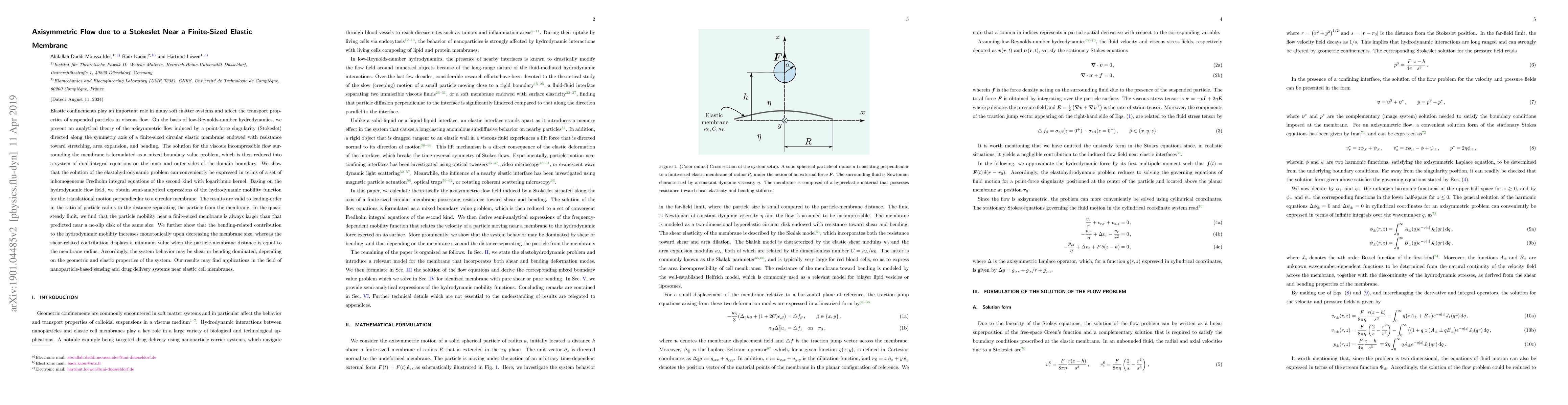 Researchers developed an analytical theory for how a Stokeslet affects axisymmetric flow near a finite-sized elastic membrane, revealing that the system can behave as either shear or bending dominated, depending on its geometry and elasticity.