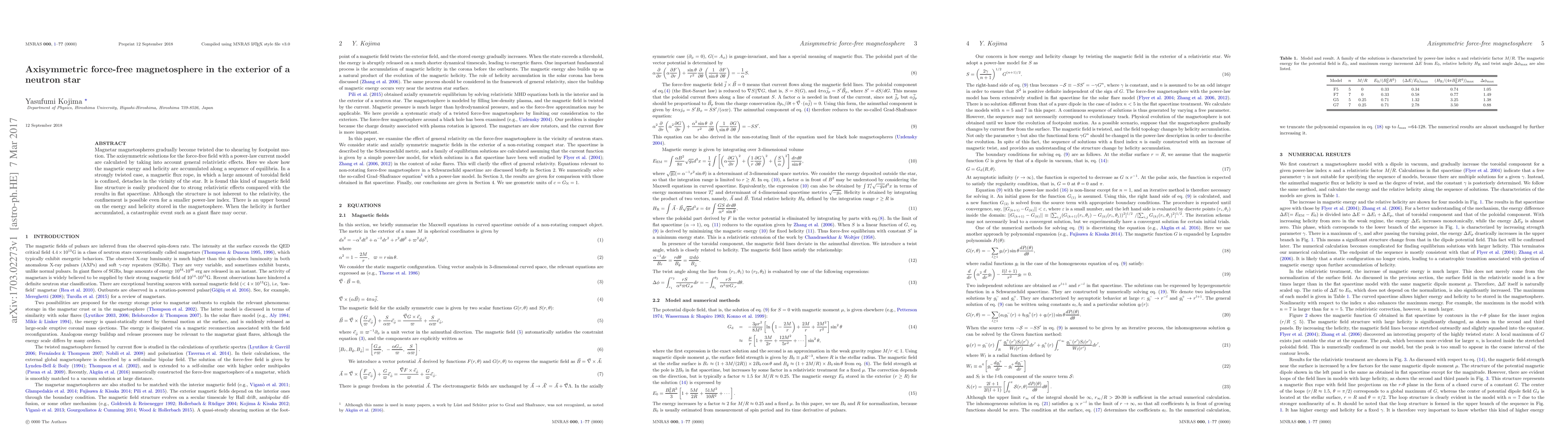 This paper investigates the axisymmetric force-free magnetosphere around a neutron star, focusing on the accumulation of magnetic energy and helicity in twisted magnetic fields. The study reveals that strong relativistic effects facilitate the formation of a magnetic flux rope, which can detach near the star, and highlights an upper limit for stored energy and helicity, beyond which catastrophic events like giant flares may occur.