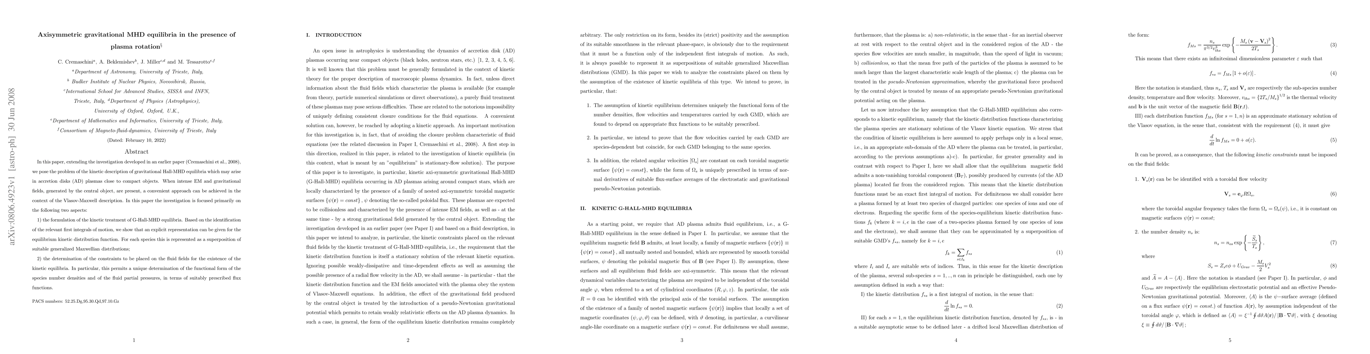 In this paper, extending the investigation developed in an earlier paper (Cremaschini et al., 2008), we pose the problem of the kinetic description of gravitational Hall-MHD equilibria which may arise in accretion disks (AD) plasmas close to compact objects. When intense EM and gravitational fields, generated by the central object, are present, a convenient approach can be achieved in the context of the Vlasov-Maxwell description. In this paper the investigation is focused primarily on the following two aspects: 1) the formulation of the kinetic treatment of G-Hall-MHD equilibria. Based on the identification of the relevant first integrals of motion, we show that an explicit representation can be given for the equilibrium kinetic distribution function. For each species this is represented as a superposition of suitable generalized Maxwellian distributions; 2) the determination of the constraints to be placed on the fluid fields for the existence of the kinetic equilibria. In particular, this permits a unique determination of the functional form of the species number densities and of the fluid partial pressures, in terms of suitably prescribed flux functions.