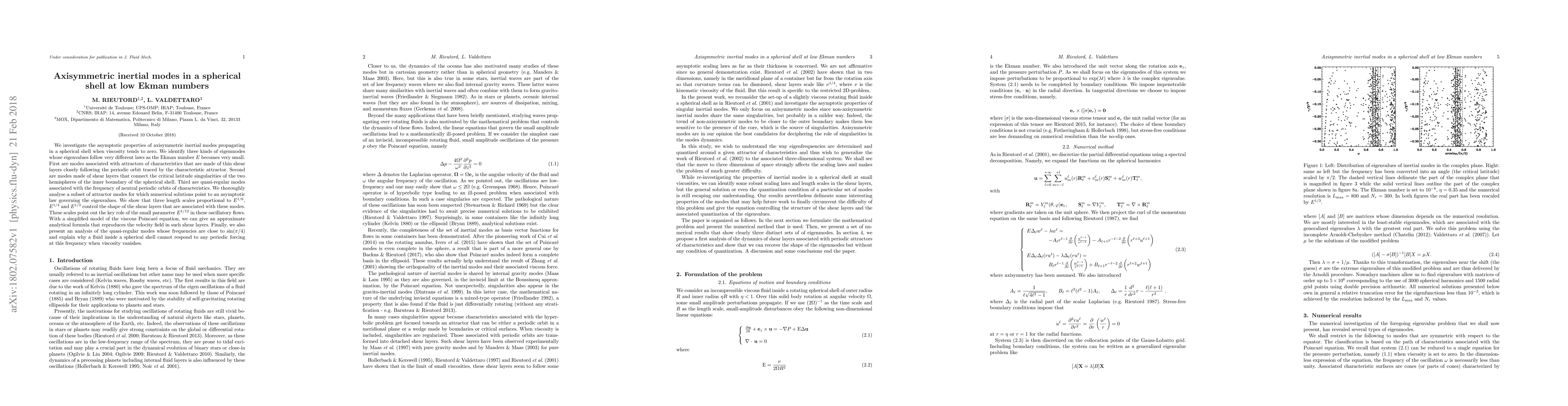 We investigate the asymptotic properties of axisymmetric inertial modes propagating in a spherical shell when viscosity tends to zero. We identify three kinds of eigenmodes whose eigenvalues follow very different laws as the Ekman number $E$ becomes very small. First are modes associated with attractors of characteristics that are made of thin shear layers closely following the periodic orbit traced by the characteristic attractor. Second are modes made of shear layers that connect the critical latitude singularities of the two hemispheres of the inner boundary of the spherical shell. Third are quasi-regular modes associated with the frequency of neutral periodic orbits of characteristics. We thoroughly analyse a subset of attractor modes for which numerical solutions point to an asymptotic law governing the eigenvalues. We show that three length scales proportional to $E^{1/6}$, $E^{1/4}$ and $E^{1/3}$ control the shape of the shear layers that are associated with these modes. These scales point out the key role of the small parameter $E^{1/12}$ in these oscillatory flows. With a simplified model of the viscous Poincar\'e equation, we can give an approximate analytical formula that reproduces the velocity field in such shear layers. Finally, we also present an analysis of the quasi-regular modes whose frequencies are close to $\sin(\pi/4)$ and explain why a fluid inside a spherical shell cannot respond to any periodic forcing at this frequency when viscosity vanishes.