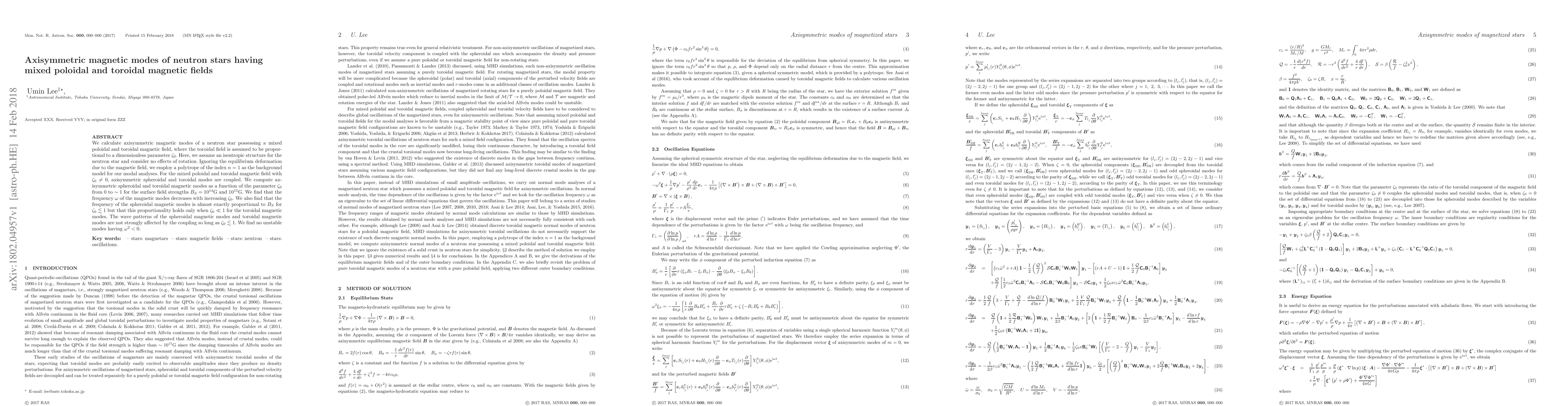 This paper investigates axisymmetric magnetic modes in neutron stars with mixed poloidal and toroidal magnetic fields, finding that mode frequencies decrease with increasing toroidal field strength. The study shows that while spheroidal modes are proportional to surface field strength, this holds only for small toroidal field ratios.