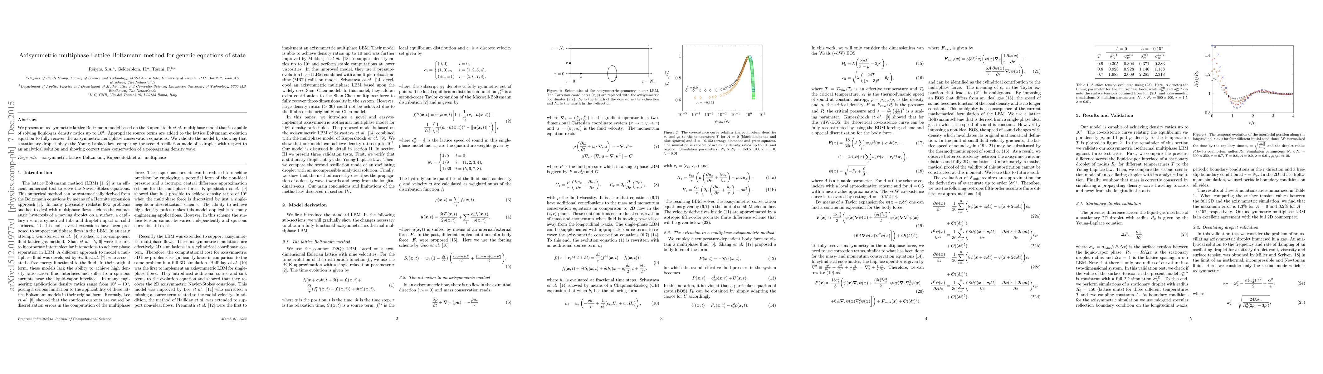 This paper introduces an axisymmetric multiphase Lattice Boltzmann method based on Kupershtokh et al.'s model, capable of handling high liquid-gas density ratios up to $10^3$. The model is validated through tests showing compliance with the Young-Laplace law and accurate mass conservation.