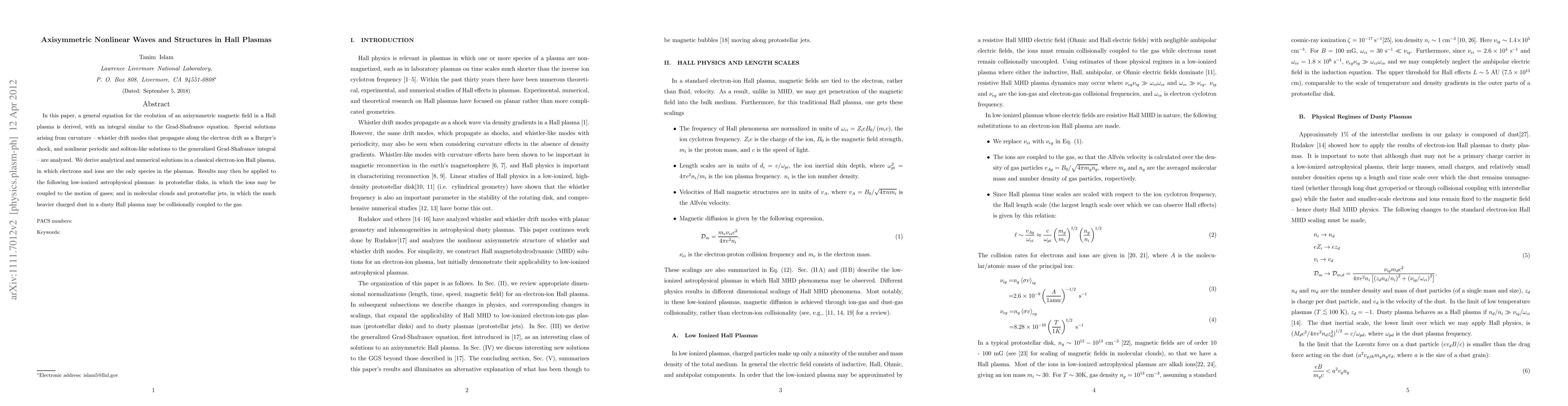 In this paper, a general equation for the evolution of an axisymmetric magnetic field in a Hall plasma is derived, with an integral similar to the Grad-Shafranov equation. Special solutions arising from curvature -- whistler drift modes that propagate along the electron drift as a Burger's shock, and nonlinear periodic and soliton-like solutions to the generalized Grad-Shafranov integral -- are analyzed. We derive analytical and numerical solutions in a classical electron-ion Hall plasma, in which electrons and ions are the only species in the plasmas. Results may then be applied to the following low-ionized astrophysical plasmas: in protostellar disks, in which the ions may be coupled to the motion of gases; and in molecular clouds and protostellar jets, in which the much heavier charged dust in a dusty Hall plasma may be collisionally coupled to the gas.