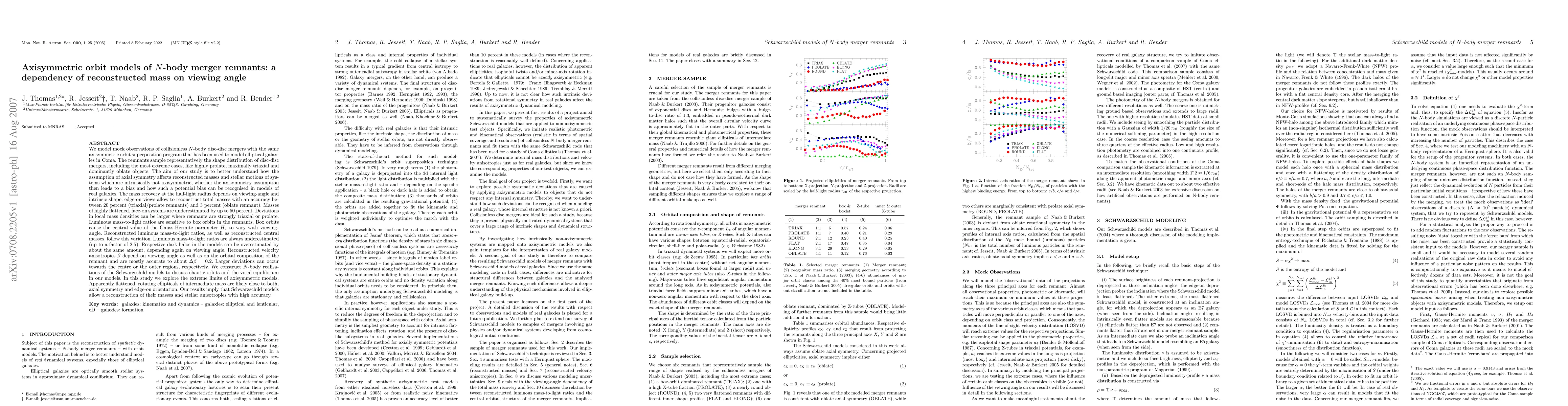 We model mock observations of collisionless N-body disc-disc mergers with an axisymmetric orbit superposition program that has been used to model Coma ellipticals. The remnants sample representatively the shapes of disc-disc mergers including prolate, triaxial and oblate objects. The aim is to better understand how the assumption of axial symmetry affects reconstructed masses and stellar motions of systems which are intrinsically not axisymmetric, whether it leads to a bias and how such a potential bias can be recognised in models of real galaxies. The mass recovery at the half-light radius depends on viewing-angle and intrinsic shape: edge-on views allow to reconstruct total masses with an accuracy between 20% (triaxial/prolate remnants) and 3% (oblate remnant). Masses of highly flattened, face-on systems are underestimated by up to 50%. Deviations in local mass densities can be larger where remnants are strongly triaxial or prolate. Luminous M/L are sensitive to box orbits in the remnants. Box orbits cause the central kinematics to vary with viewing-angle. Reconstructed luminous M/L and central masses follow this variation. Luminous M/L are always underestimated (up to a factor of 2.5). Respective dark halos in the models can be overestimated by about the same amount, depending again on viewing angle. Reconstructed velocity anisotropies depend on viewing angle and on the orbital composition of the remnant. We construct N-body realisations of the Schwarzschild models to discuss chaotic orbits and the virial equilibrium in our models. Apparently flattened, rotating ellipticals of intermediate mass are likely close to both, axial symmetry and edge-on orientation. Our results imply that Schwarzschild models allow a reconstruction of their masses and stellar anisotropies with high accuracy. (abridged)