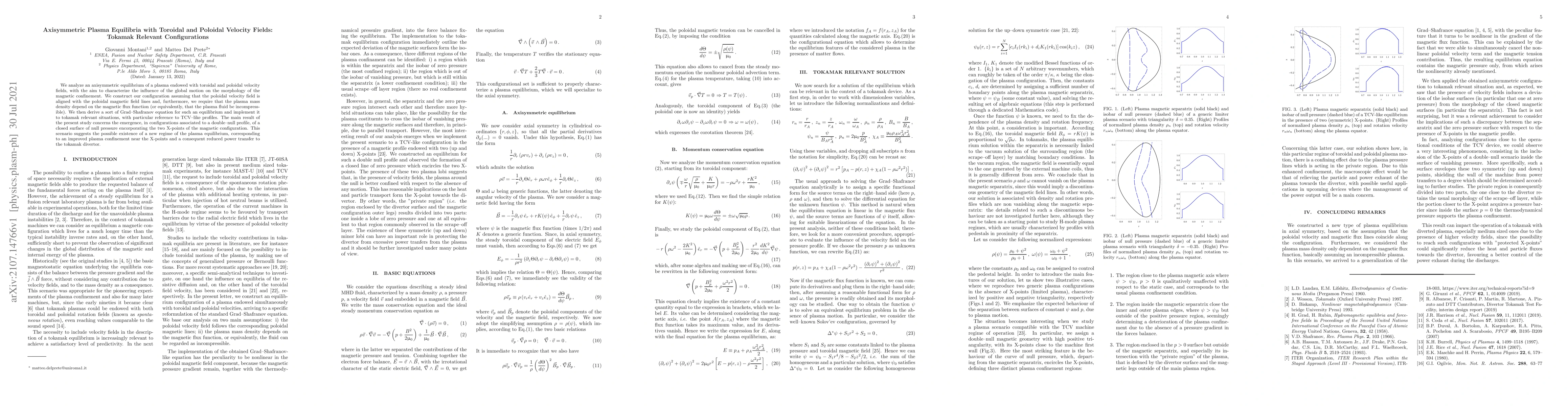 This paper investigates axisymmetric plasma equilibria in tokamaks with toroidal and poloidal velocity fields, deriving a Grad-Shafranov equation for the configuration. It reveals a new regime in double-null profiles with improved confinement near X-points, potentially reducing power transfer to the divertor.