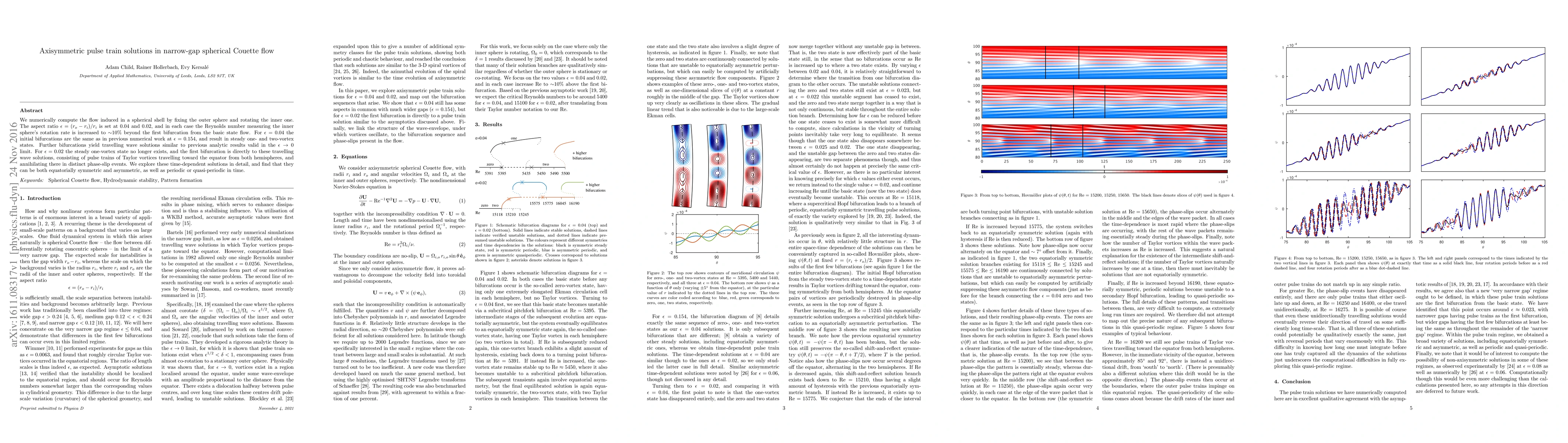 We numerically compute the flow induced in a spherical shell by fixing the outer sphere and rotating the inner one. The aspect ratio $\epsilon=(r_o-r_i)/r_i$ is set at 0.04 and 0.02, and in each case the Reynolds number measuring the inner sphere's rotation rate is increased to $\sim10\%$ beyond the first bifurcation from the basic state flow. For $\epsilon =0.04$ the initial bifurcations are the same as in previous numerical work at $\epsilon=0.154$, and result in steady one- and two-vortex states. Further bifurcations yield travelling wave solutions similar to previous analytic results valid in the $\epsilon\to0$ limit. For $\epsilon=0.02$ the steady one-vortex state no longer exists, and the first bifurcation is directly to these travelling wave solutions, consisting of pulse trains of Taylor vortices travelling toward the equator from both hemispheres, and annihilating there in distinct phase-slip events. We explore these time-dependent solutions in detail, and find that they can be both equatorially symmetric and asymmetric, as well as periodic or quasi-periodic in time.