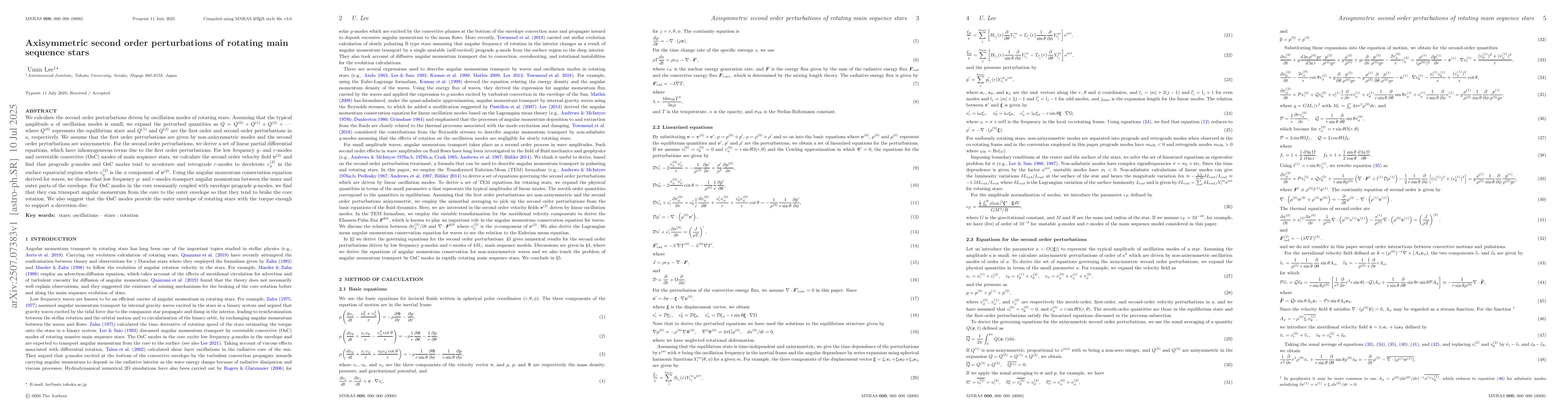 We calculate the second order perturbations driven by oscillation modes of rotating stars. Assuming that the typical amplitude $a$ of oscillation modes is small, we expand the perturbed quantities as $Q=Q^{(0)}+Q^{(1)}+Q^{(2)}+\cdots$ where $Q^{(0)}$ represents the equilibrium state and $Q^{(1)}$ and $Q^{(2)}$ are the first order and second order perturbations in $a$, respectively. We assume that the first order perturbations are given by non-axisymmetric modes and the second order perturbations are axisymmetric. For the second order perturbations, we derive a set of linear partial differential equations, which have inhomogeneous terms due to the first order perturbations. For low frequency $g$- and $r$-modes and overstable convective (OsC) modes of main sequence stars, we calculate the second order velocity field $\mathbf{v}^{(2)}$ and find that prograde $g$-modes and OsC modes tend to accelerate and retrograde $r$-modes to decelerate $v_\phi^{(2)}$ in the surface equatorial regions where $v_\phi^{(2)}$ is the $\phi$ component of $\mathbf{v}^{(2)}$. Using the angular momentum conservation equation derived for waves, we discuss that low frequency $g$- and $r$-modes transport angular momentum between the inner and outer parts of the envelope. For OsC modes in the core resonantly coupled with envelope prograde $g$-modes, we find that they can transport angular momentum from the core to the outer envelope so that they tend to brake the core rotation. We also suggest that the OsC modes provide the outer envelope of rotating stars with the torque enough to support a decretion disc.
