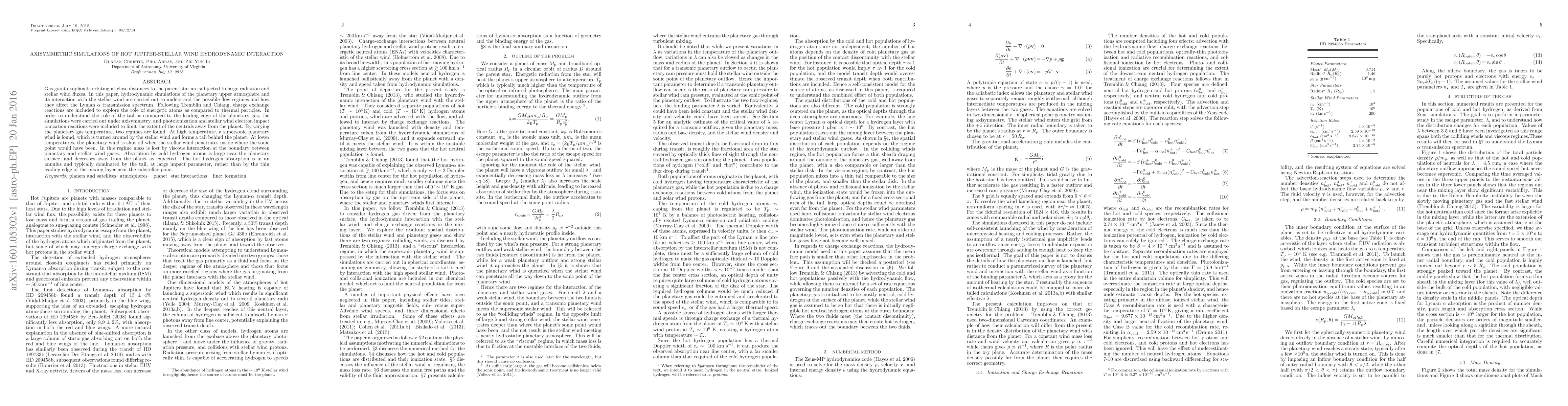 Gas giant exoplanets orbiting at close distances to the parent star are subjected to large radiation and stellar wind fluxes. In this paper, hydrodynamic simulations of the planetary upper atmosphere and its interaction with the stellar wind are carried out to understand the possible flow regimes and how they affect the Lyman-alpha transmission spectrum. Following Tremblin and Chiang, charge exchange reactions are included to explore the role of energetic atoms as compared to thermal particles. In order to understand the role of the tail as compared to the leading edge of the planetary gas, the simulations were carried out under axisymmetry, and photoionization and stellar wind electron impact ionization reactions were included to limit the extent of the neutrals away from the planet. By varying the planetary gas temperature, two regimes are found. At high temperature, a supersonic planetary wind is found, which is turned around by the stellar wind and forms a tail behind the planet. At lower temperatures, the planetary wind is shut off when the stellar wind penetrates inside where the sonic point would have been. In this regime mass is lost by viscous interaction at the boundary between planetary and stellar wind gases. Absorption by cold hydrogen atoms is large near the planetary surface, and decreases away from the planet as expected. The hot hydrogen absorption is in an annulus and typically dominated by the tail, at large impact parameter, rather than by the thin leading edge of the mixing layer near the substellar point.