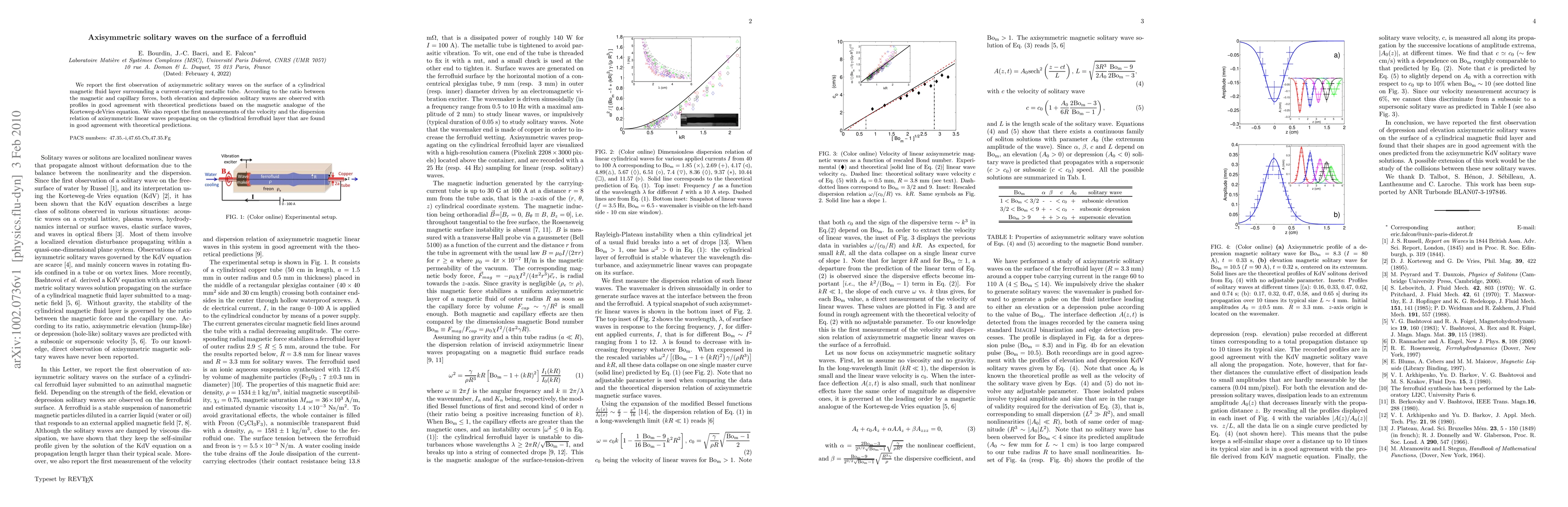 This study observes axisymmetric solitary waves on a ferrofluid's surface, showing both elevation and depression waves in agreement with theoretical models. It also measures the velocity and dispersion relation of linear waves, corroborating theoretical predictions.