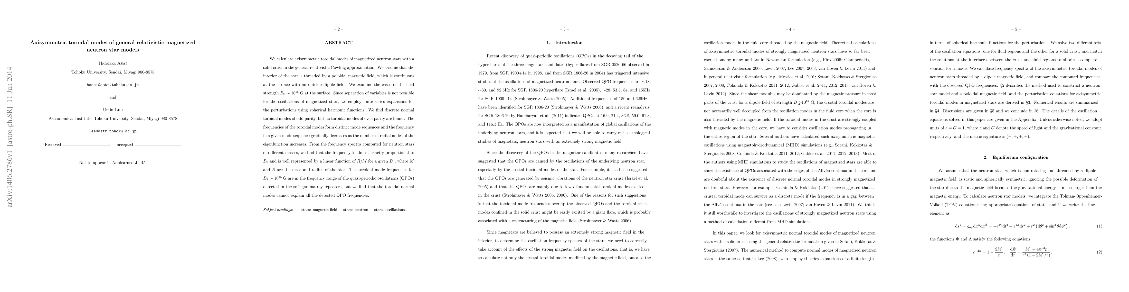This paper investigates axisymmetric toroidal oscillation modes in magnetized neutron stars with a solid crust, using general relativistic Cowling approximation. It finds discrete odd-parity toroidal modes but none of even parity, with frequencies proportional to surface magnetic field strength and star's radius/mass ratio. While frequencies match some quasi-periodic oscillations in soft-gamma-ray repeaters, they cannot fully explain all detected QPOs.