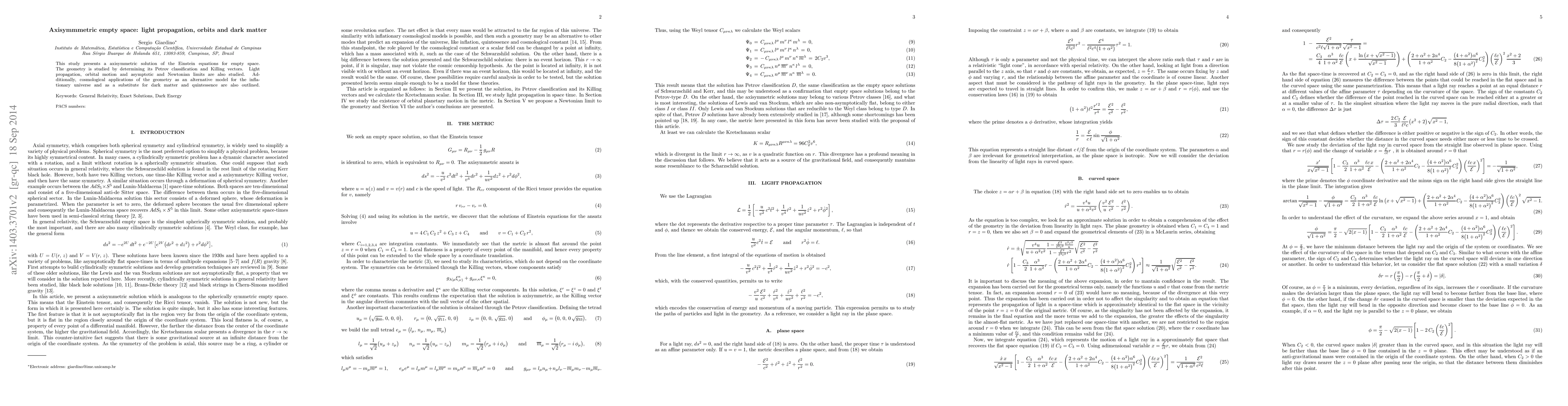 Researchers developed an axisymmetric solution to Einstein equations for empty space, studying light propagation, orbits, and cosmological applications, offering an alternative model for the inflationary universe and dark matter.